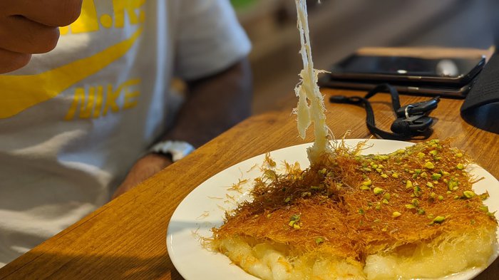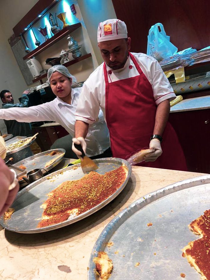 Al-Aker Bakery and Cold Stores is the jewel of desserts in the Qatari city of Doha, which offers a distinctive assortment of oriental desserts, such as the authentic Nabulsi Kunafa, which is carefully prepared by melting the local Nabulsi cheese with white salt over freshly fried pie dough, then it is flipped and covered with rich syrup and freshly ground pistachios. . Here you will also find baklava, warabat, Zainab fingers, pies and qatayef.