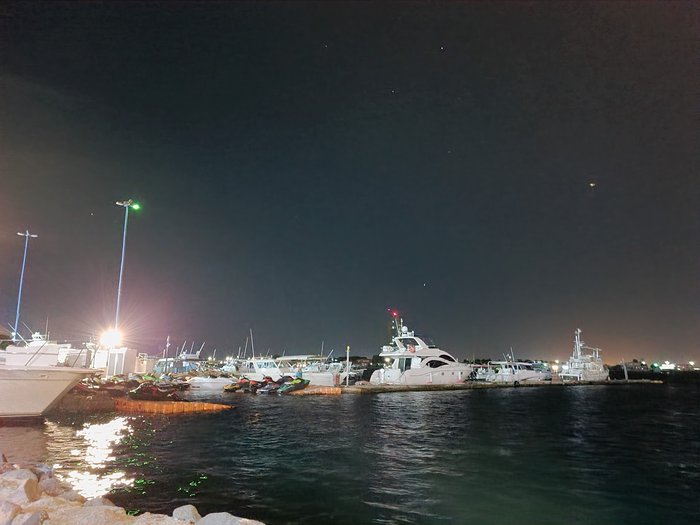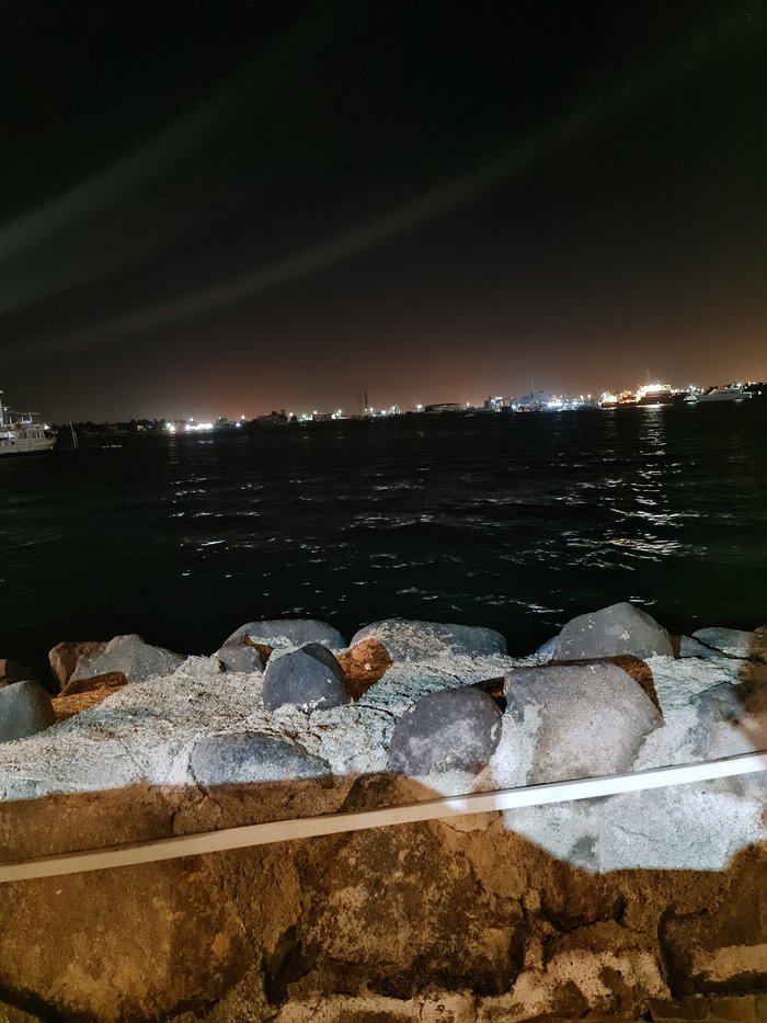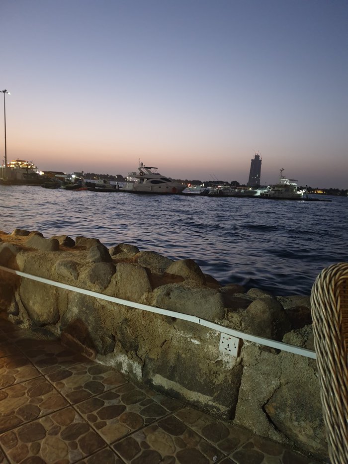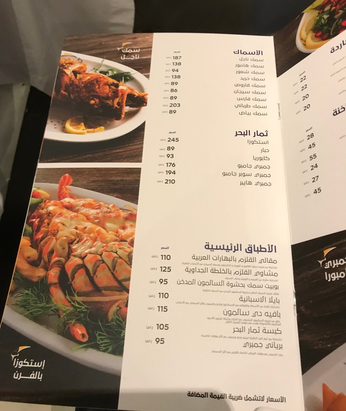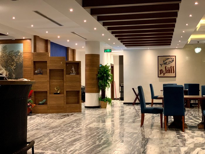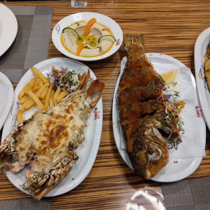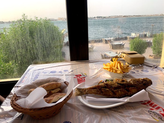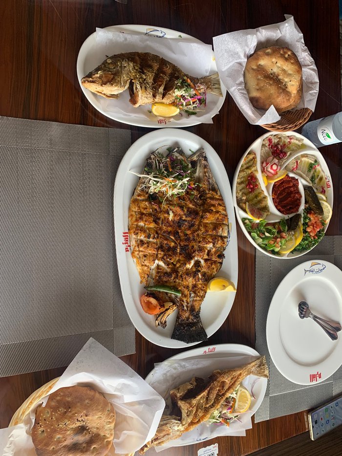 Customers of the Qalzam Fish Restaurant, tourists and locals, sit in its outdoor yard overlooking the sea and enjoy eating various types of seafood in different ways of preparation, accompanied by types of appetizers, Arab and international salads, sauces rich in flavors of wild herbs and fresh vegetables, and many varieties of refreshing cold drinks.