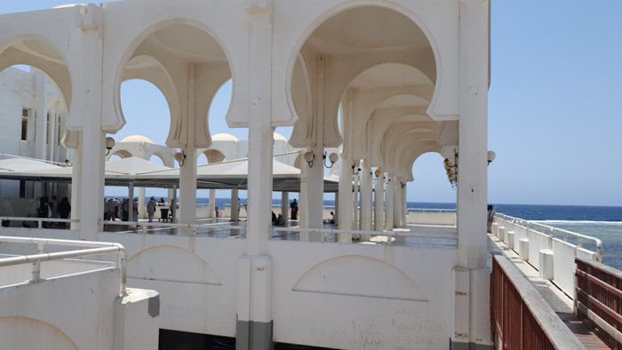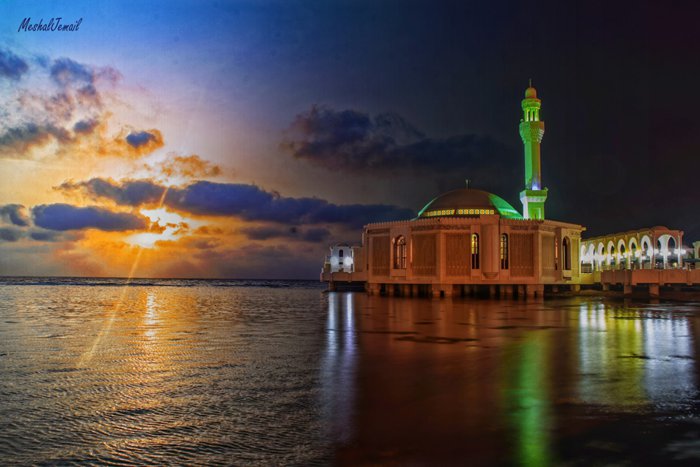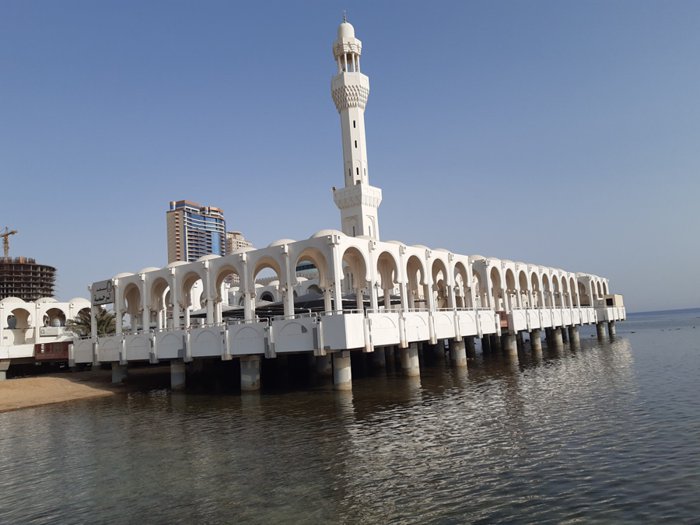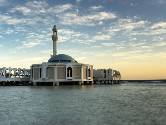 The Floating Mosque is a modern mosque built on the edge of the Jeddah Corniche beach in the Kingdom of Saudi Arabia. It is officially called the Al-Rahma Mosque, while the public calls it the Fatima Al-Zahra Mosque. This mosque is one of the most visited mosques in Jeddah, especially among East Asian Muslims who perform Umrah and pilgrims. The mosque is a wonderful mixture of modern and ancient architecture and Islamic art, built with the latest technology and equipment, with advanced sound and lighting systems. The mosque, which was built on the Red Sea coast, attracts a large number of visitors and tourists to perform prayers and enjoy its external and internal appearance, as the latter is unique in its distinctive interior designs and decorations. The mosque accommodates a large number of worshipers, and places for ablution, toilets, and comfortable halls for worship are exquisitely equipped.