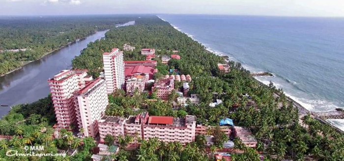 world-famous temple located 29 km from Kollam. This temple was initially a house for the family of a woman called "Ama", a name she acquired later and means the Indian mother, and after she acquired and attracted the students from all over the world to deliver her life and religious teachings to them, the building turned into a temple and dozens of huts were added for the students near it. The temple currently accommodates more than 5,000 students.