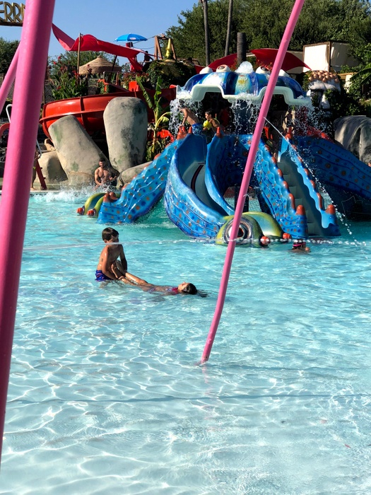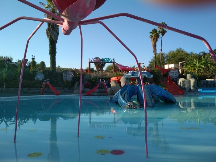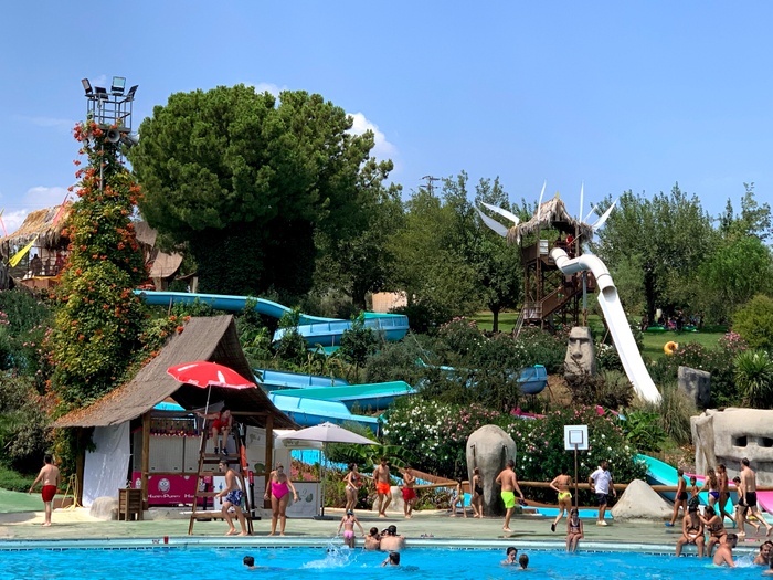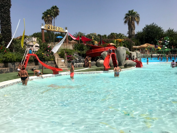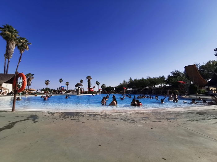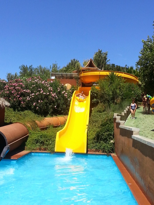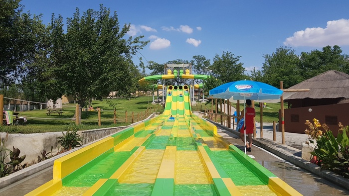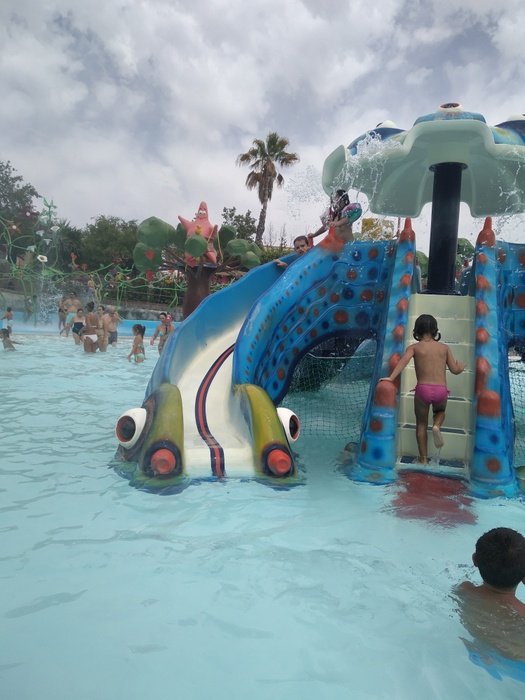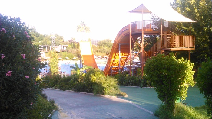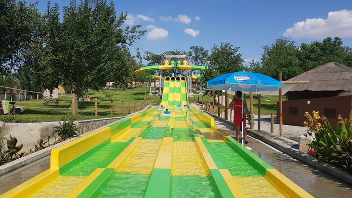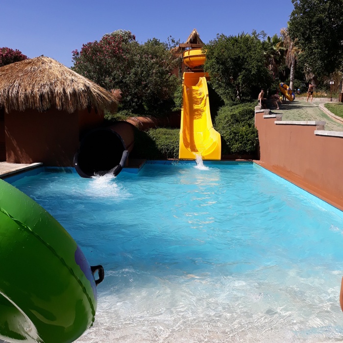 This park has seven different slides, including a slide called the Black Hole, in addition to a large children's pool with a group of small distinctive games, and another pool called "The Beach". The water park has VIP spaces where they get a shaded deck with sun loungers and a table and chairs for six. The garden also has a snack bar with a shaded outdoor seating area.