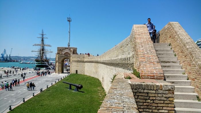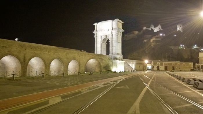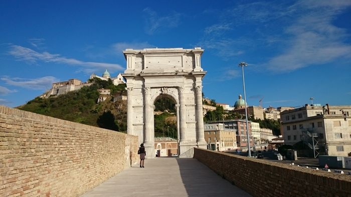 Trajan's Arch or as it is called the "Roman Triumphal Arch" in Ancona is the Roman Triumphal Arch that was erected by the Senate and the people of Rome during the reign of Emperor Trajan in honor of him after he expanded the city's port and improved the sidewalks and fortifications in the city at his personal expense. The arch was the work of the Greek-Syrian architect Apollodorus of Damascus, and it is an arch made of Turkish marble that was specially brought from the quarries of Marmara Island, and is 18.5 meters high. It is surrounded by a group of Corinthian columns on ornate pedestals.