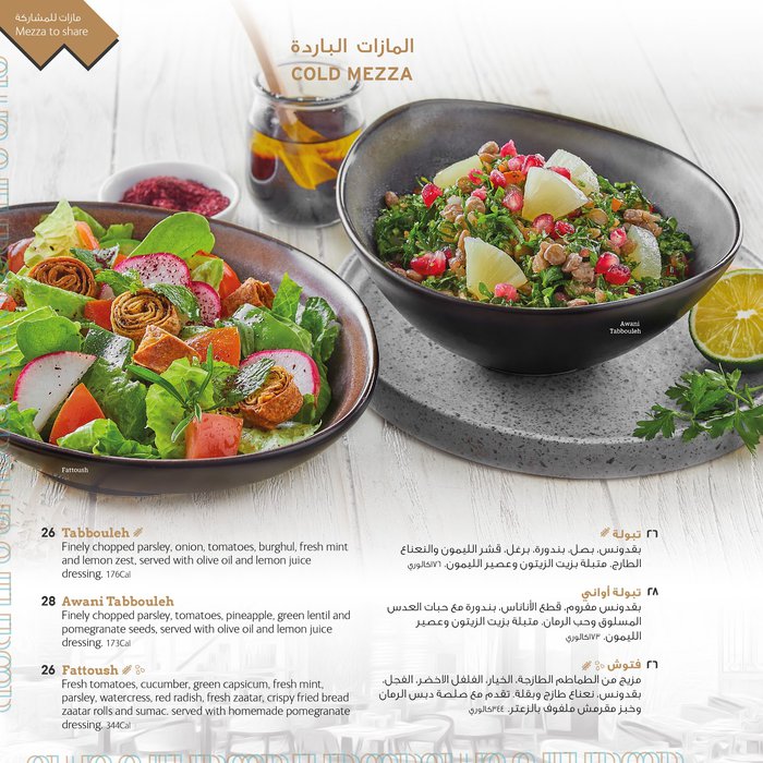 Awani Restaurant specializes in serving Lebanese, Arabic and Mediterranean food such as shawarma, grills, appetizers and delicious fresh salads; If you are in Riyadh, you must visit it with your family to eat delicious food in a special atmosphere.