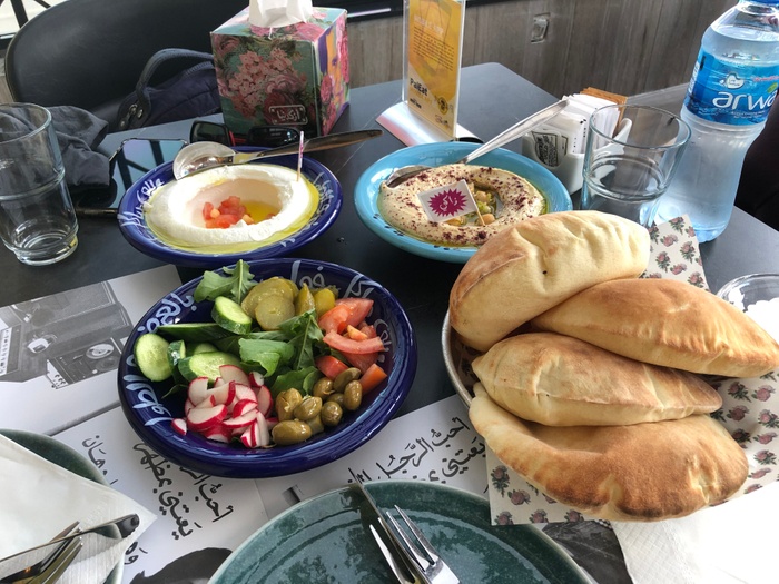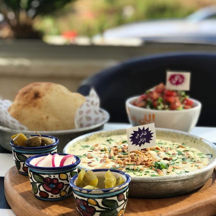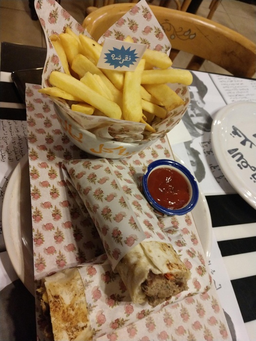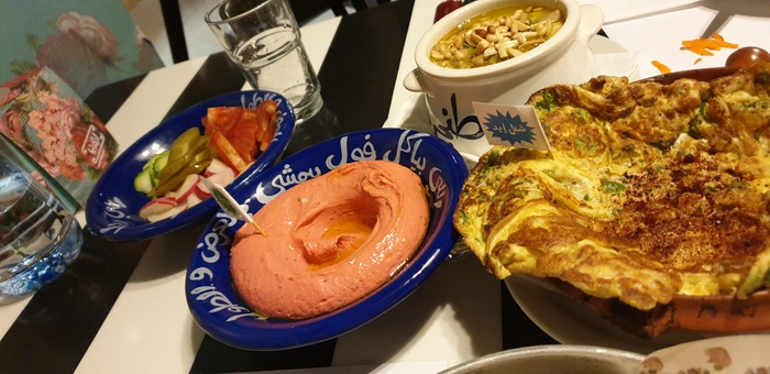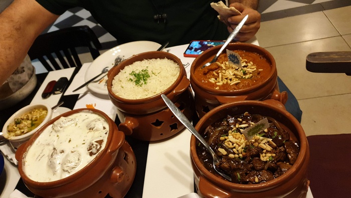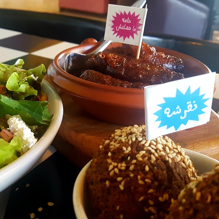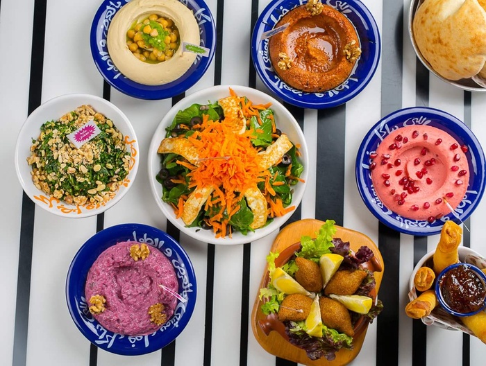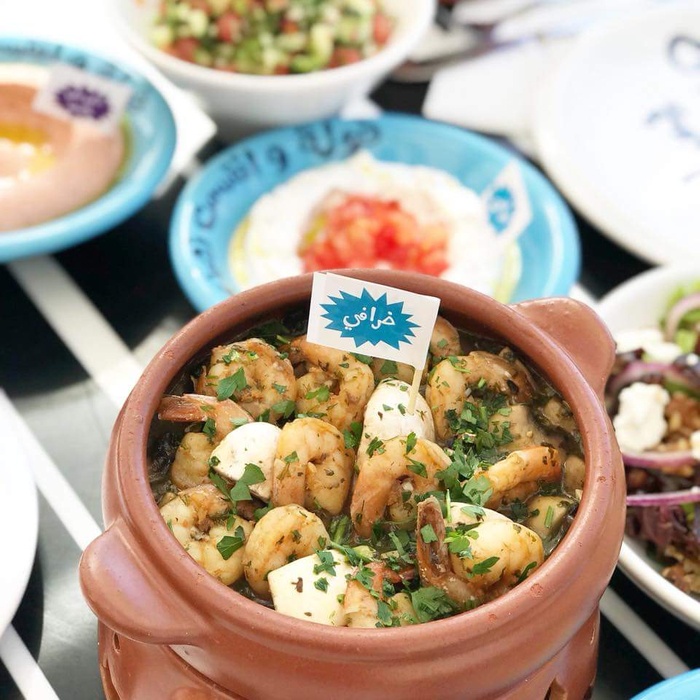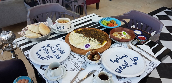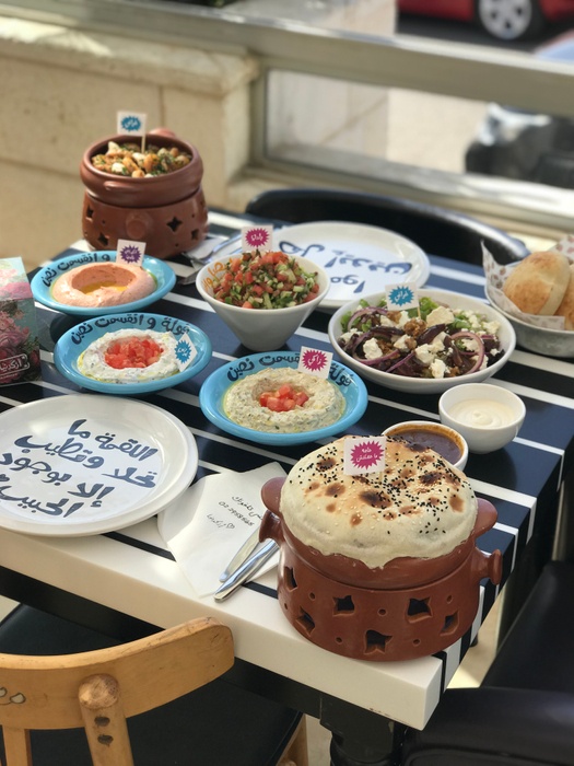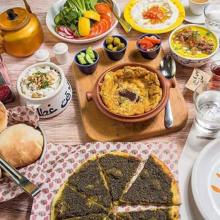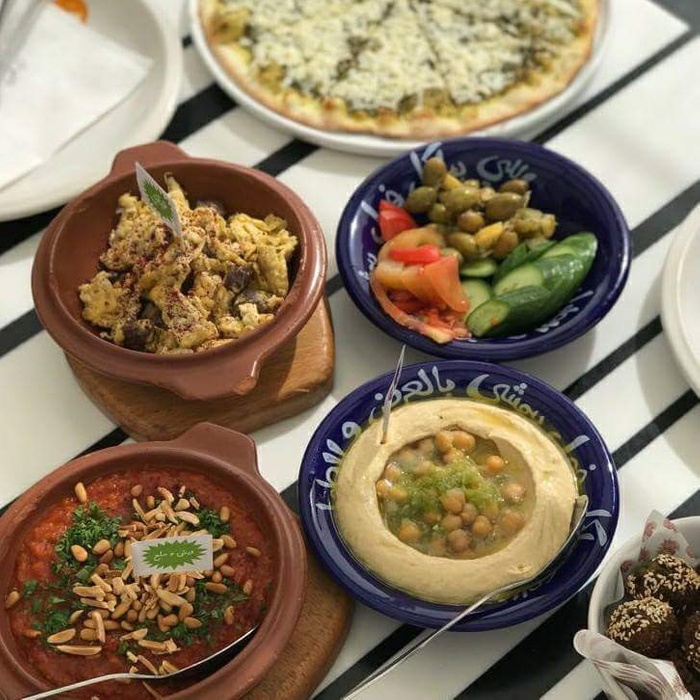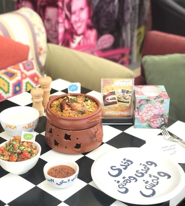 Middle Eastern restaurant with a modern and colorful decor, the walls are filled with fun paintings by ancient Arab artists. In this restaurant, you will eat delicious Middle Eastern food in a comfortable and pleasant atmosphere. The menu includes manakish, kibbeh and falafel, in addition to various pottery dishes, including freekeh with tomatoes, sayadiyah pottery and fillet pottery with vegetables, which are served alongside rice. Mansaf dishes and various grills are also available, in addition to shishbark dishes. Desserts are also available, including Umm Ali, Osmalia ice cream, and many other delicious foods and sweets that are served in distinctive dishes written with proverbs and popular sayings.