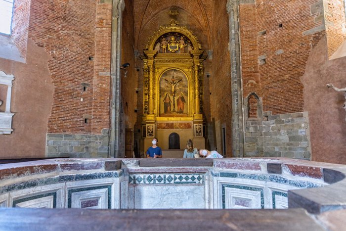 The decision to build this stunning Gothic-style church was taken in 1303, and the two-tone marble exterior was completed in 1339 by the famous architect Celino de Nice. It is believed that this building was inspired by the eastern Levantine buildings, as this architect visited the Levant and admired the unique white and gray architecture. Inside, the church features a stunning golden altar and mosaic-covered walls.