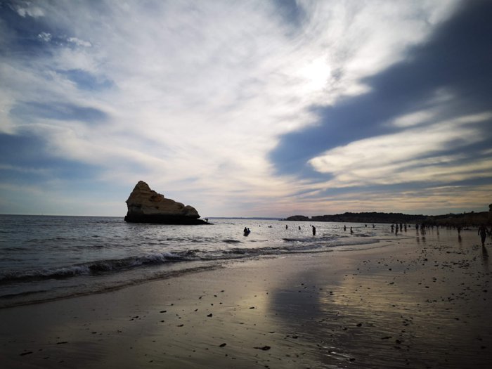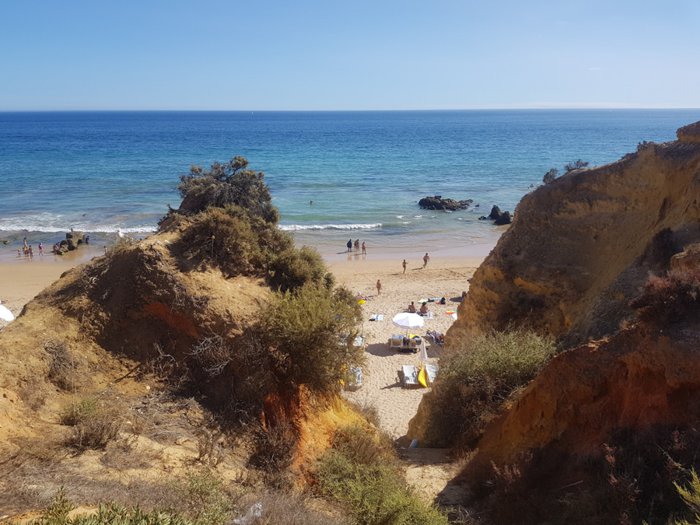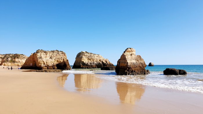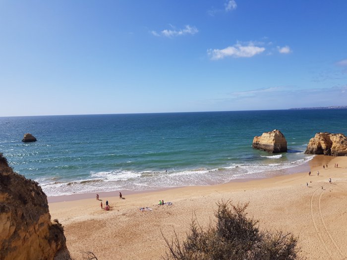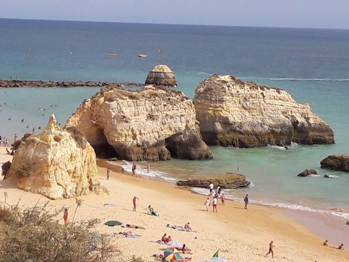 Tres Castelos Beach is located next to the Three Castles Observation Deck in the city of Portimao, and from this beach you will see the distinctive rock formations that contain arches, caves and rocky ledges that birds find and stand around such as hawks, herring gulls, black-headed gulls and pigeons; It is visited by many residents and tourists to relax and spend quality time with their friends and family.