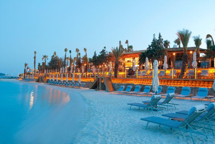 private beach and resort, offering everything you need for a wonderful and unique vacation, from sparkling crystal waters, to invigorating spa massages, in addition to a wide range of delicious, world-class dining options. This beach provides chairs, sun beds, umbrellas, and towels. It is also characterized by clean water, soft sand, and a calm and relaxing atmosphere, away from the hustle and bustle of the city.