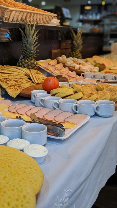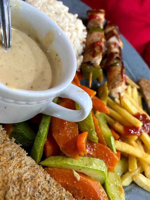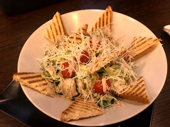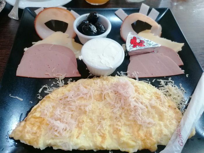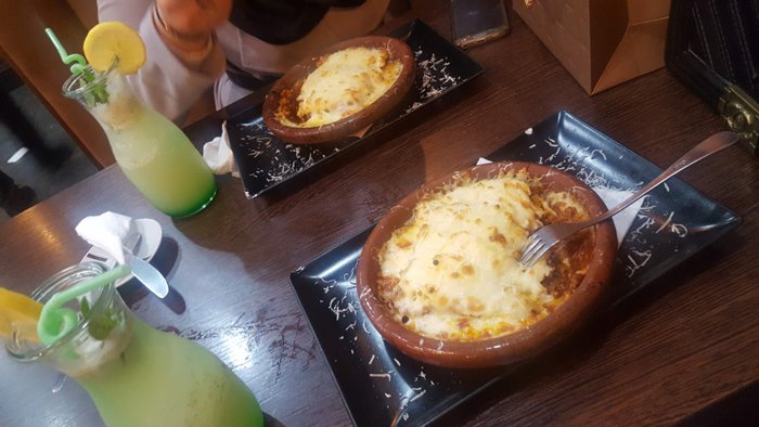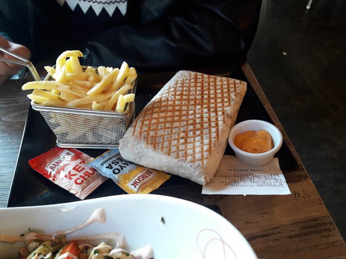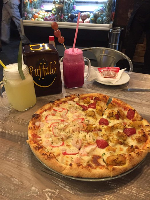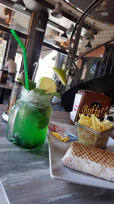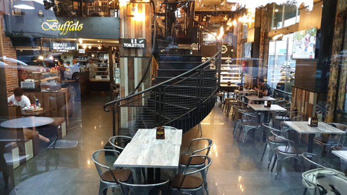 Iron chairs with simple designs are distributed around small square wooden tables, which are located in the spacious interior hall with a high ceiling, of Buffalo Restaurant, where its menu offers delicious options, including Caesar salad, fried eggs, meat sandwiches with vegetables, Italian pizza, spaghetti with meat Fried fish fillets, and many more.