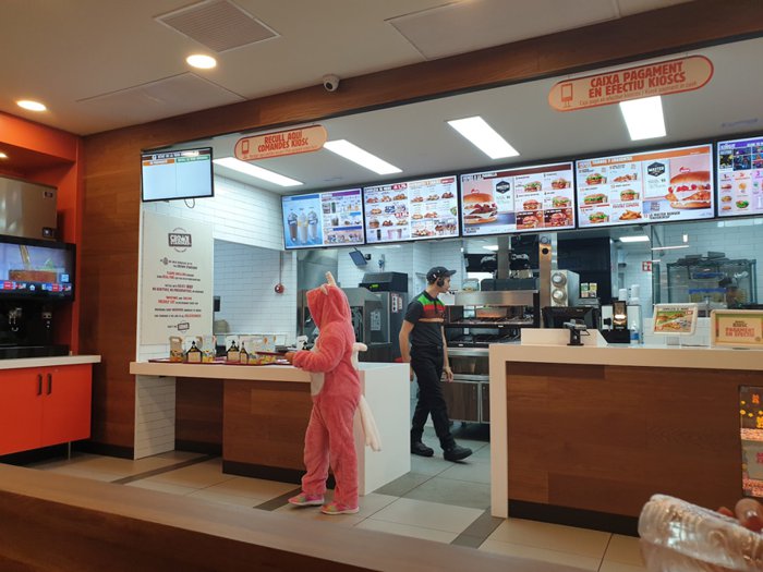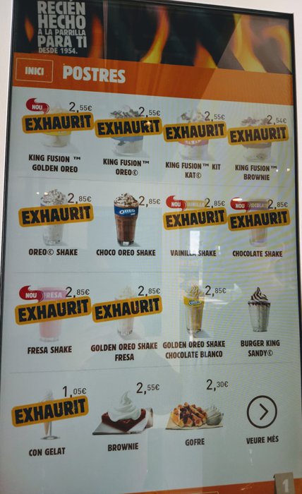 The unique menu options at the Burger King restaurant located next to the Municipal Stadium Villatinim, inside the Spanish city of Figueres, are displayed on large screens, with detailed explanations and illustrations, enabling customers to choose with ease and ease among the delicious burger sandwiches of double burger, cheese Burger, chicken burger, which is served with french fries and refreshing drinks, from soft drinks, cold juices, or many milkshakes options.