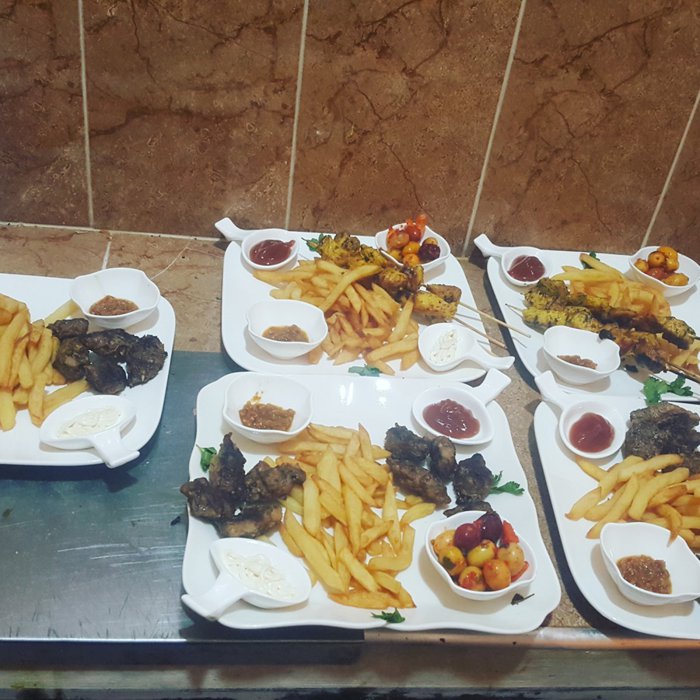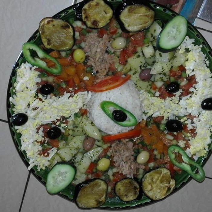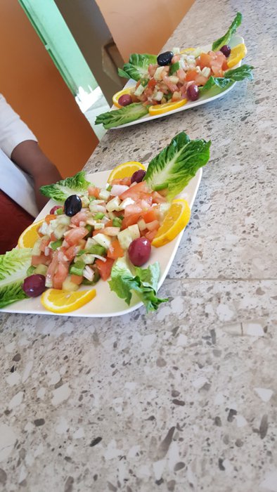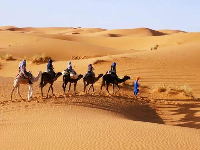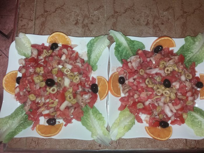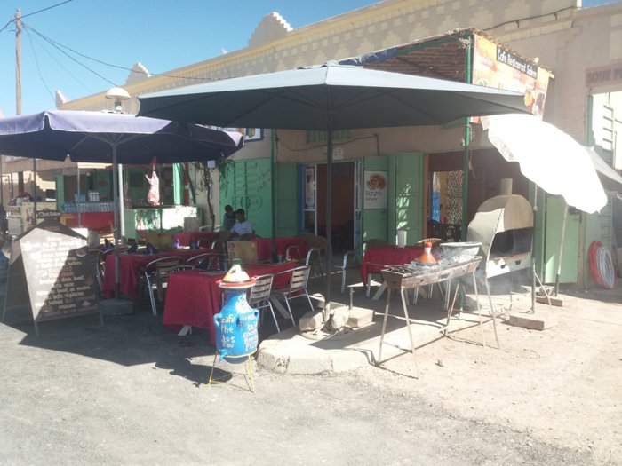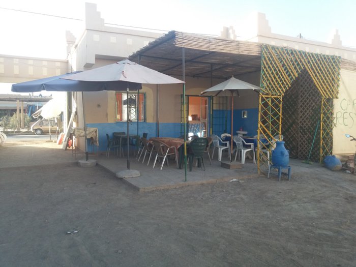 Grilled meat with fried potatoes and pickles, tuna salad with onions and tomatoes, Moroccan couscous with vegetables and meat, fresh fruit salad, meat pie with onions baked in the oven, meat tagine with nuts and pepper are part of the dishes served on the menu of Café Salem, which is located In the desert region of Merzouga, where customers sit inside the restaurant on plastic chairs and enjoy ordering their favorite options.