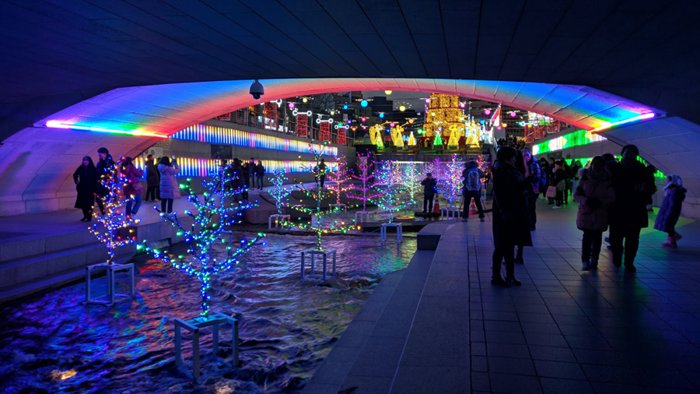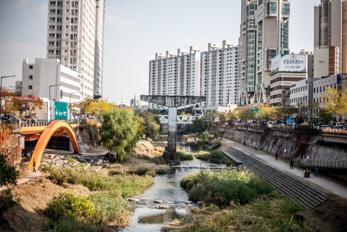 Cheonggyecheon is an 11 km modern stream that runs through downtown Seoul. It was created as part of an urban renewal project that included restoring the stream that existed during the Joseon Dynasty (1392-1910). The stream was covered by an elevated highway after the Korean War. (1950-1953) As part of the country's post-war economic development, in 2003 the highway was removed to restore the stream to its present form today. The stream begins at Cheongji Square, a famous place for cultural arts, and passes under a total of 22 bridges before flowing into the Han River, with many attractions along its length.