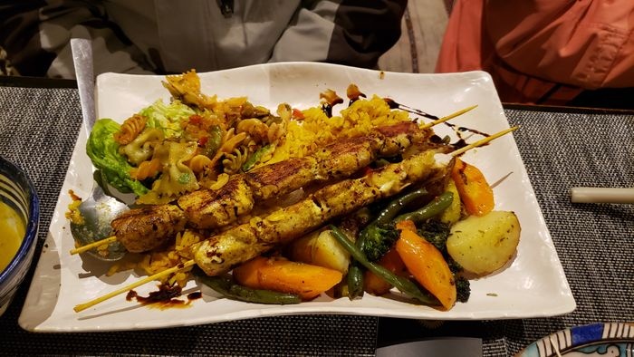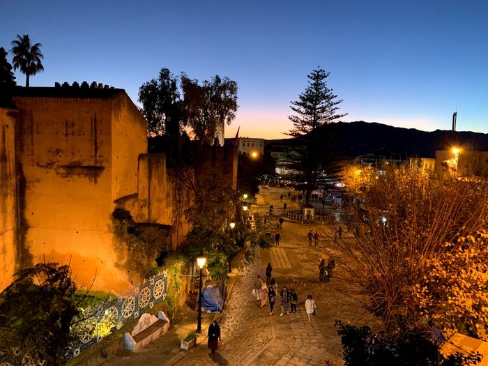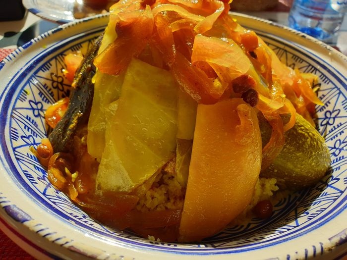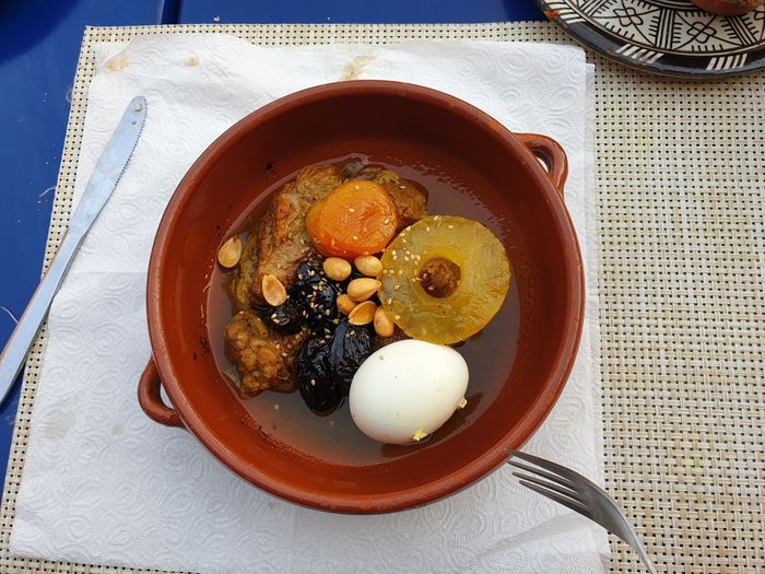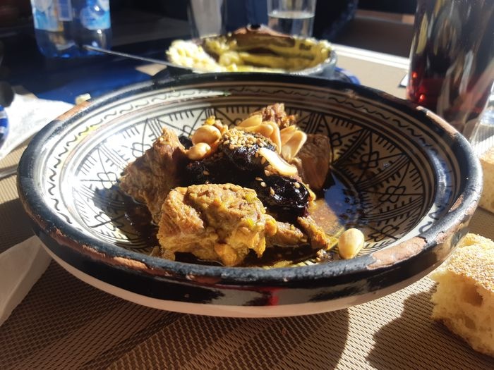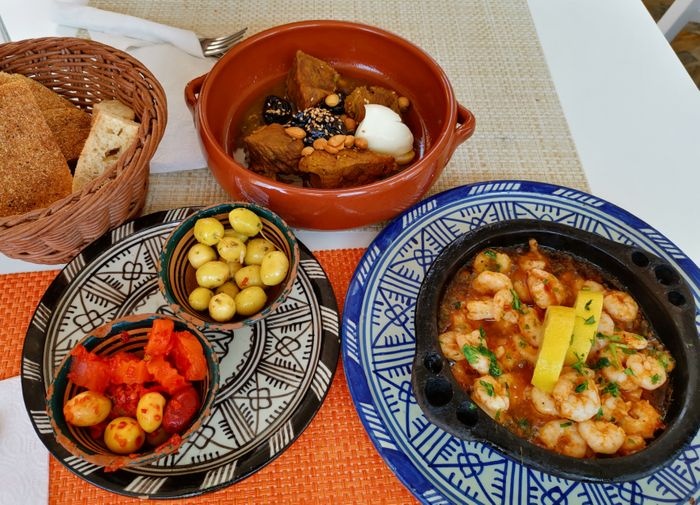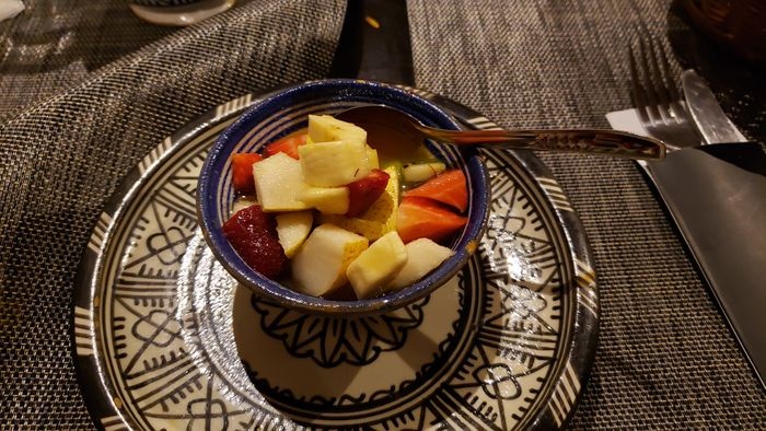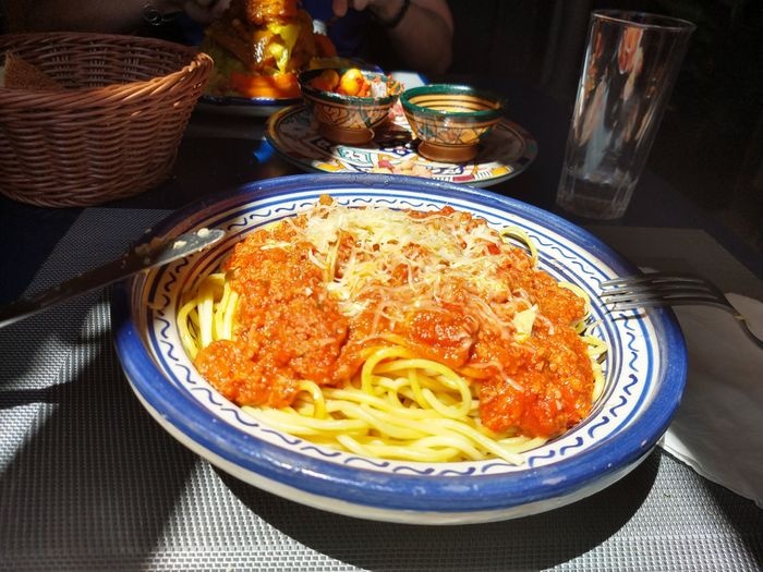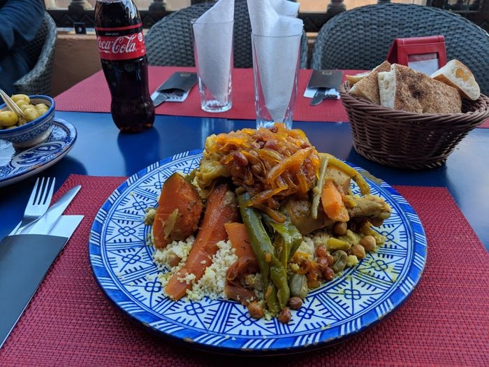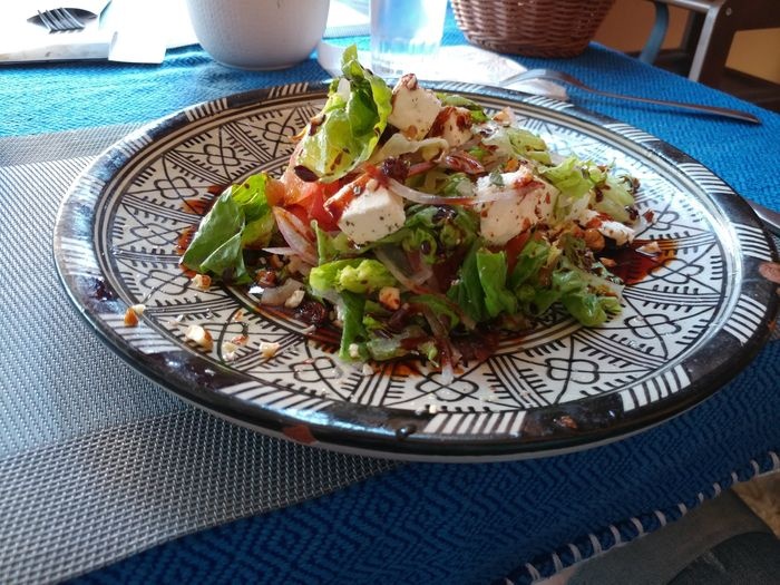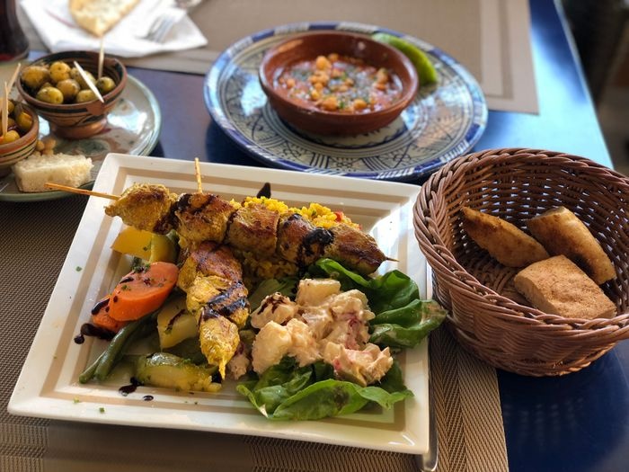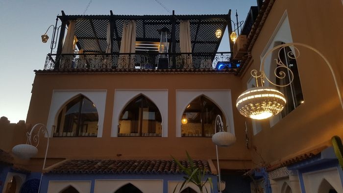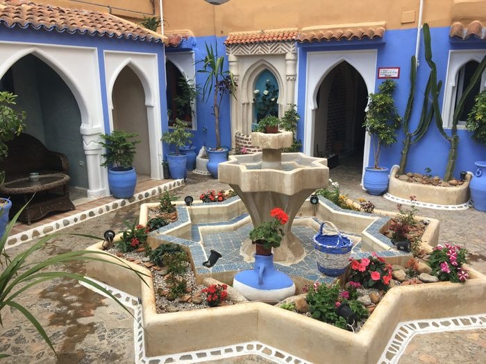 very beautiful restaurant with blue details in the style of Chefchaouen, as well as wonderful arches in the Andalusian style, an amazing historical fountain, and beautifully decorated floors. The restaurant also has a balcony that offers impressive views of the heart of the city. The restaurant offers traditional local dishes, including shrimp tagine, meat tagine with black olives, shish tawook with Moroccan spices, pasta dish with minced meat, and many more.
