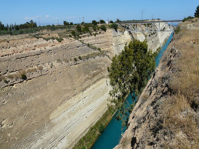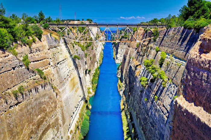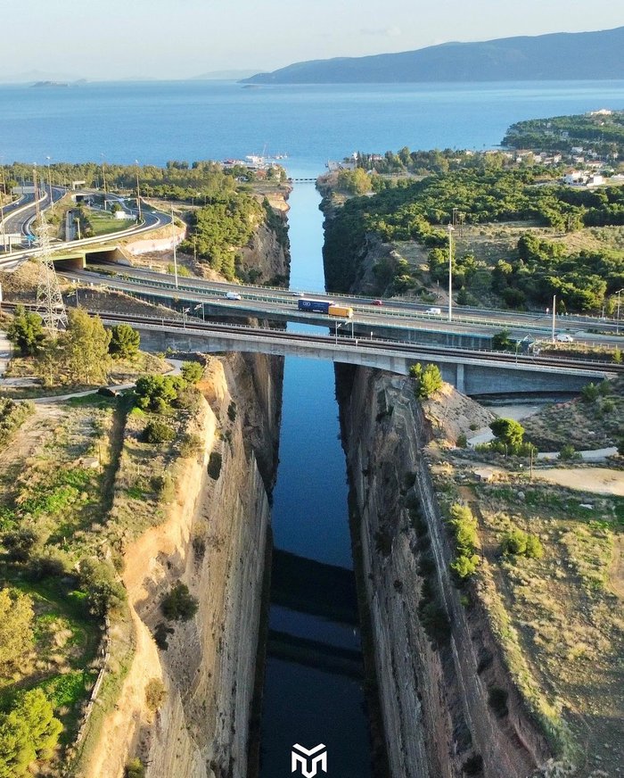 The Corinth Canal is a waterway in Greece. The passage was first crossed by boat in 600 BC when Periander built a railway for ships. This system may have been used until the 9th century; Work on the canal began in 1882 until it opened in 1893; Many tourists visit it to enjoy its charming beauty by boating or walking on the bridge over it. If you are near, don't miss it.