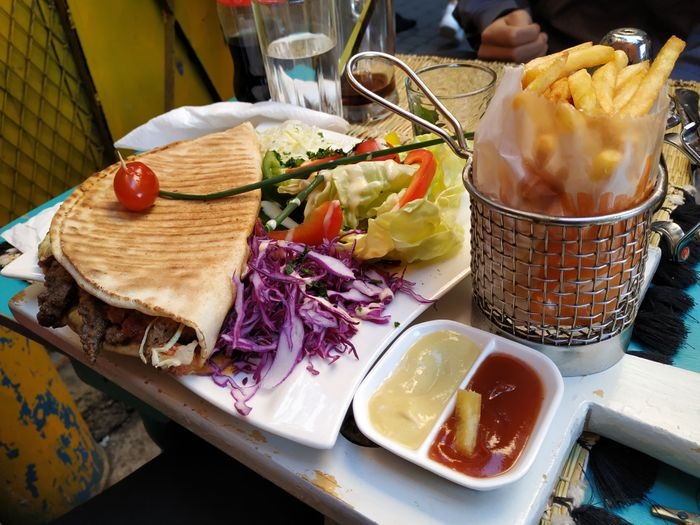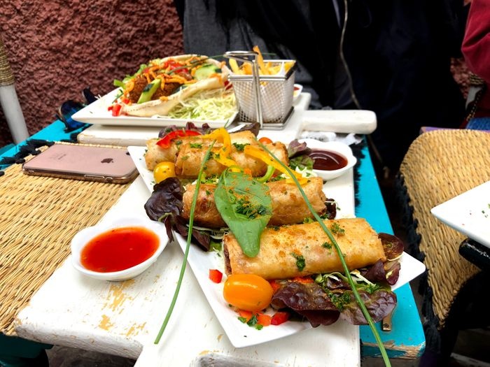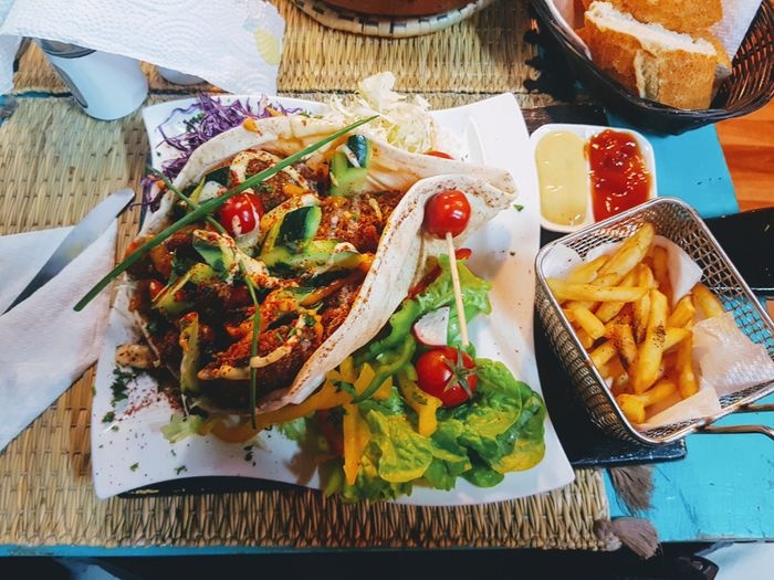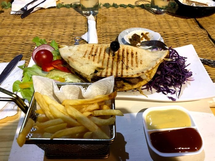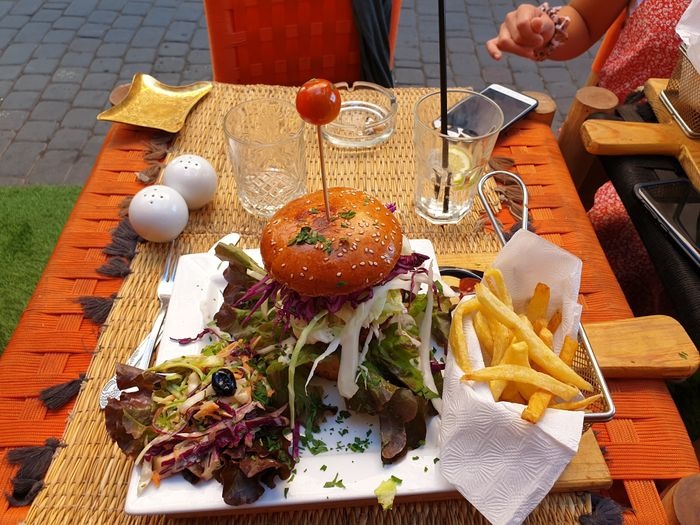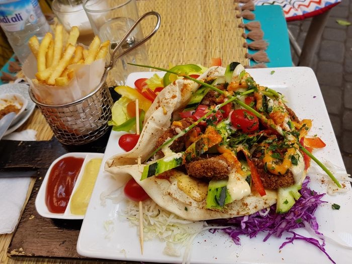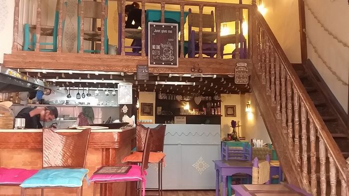 In the corner of the crowded and lively market, this distinctive café is located, which provides a comfortable and calm atmosphere for visitors, as it is characterized by its small space designed in an elegant and simple way, with straw chairs and very simple décor, and offers visitors many distinctive options that suit all tastes, as you will find children’s options and vegetarian options Among the most prominent dishes offered; Falafel sandwich filled with refreshing salads and tahini sauce, fried spring roll stuffed with spiced vegetables, in addition to the large burger served in an exceptional way with crispy fries and salads, and also offers unusual shawarma rolls served in crispy bread with salads and pickles, besides that, you can choose from types Moroccan tagine offered, such as olive and chicken tagine, lamb tagine with zucchini and pumpkin, and many other options available at reasonable prices.