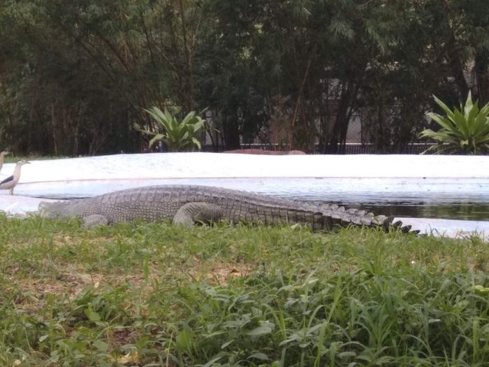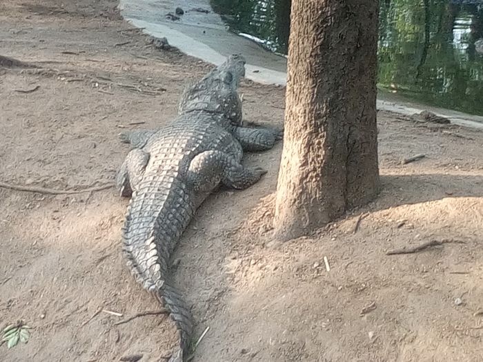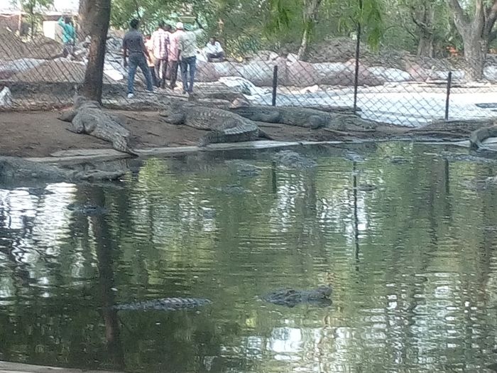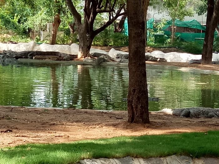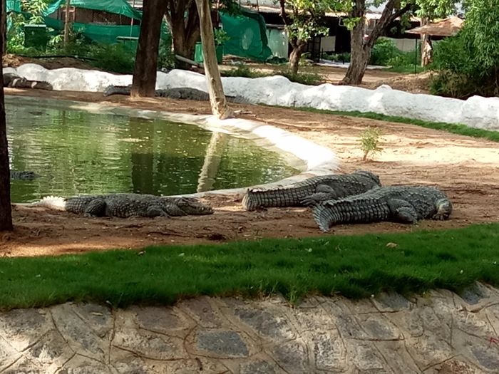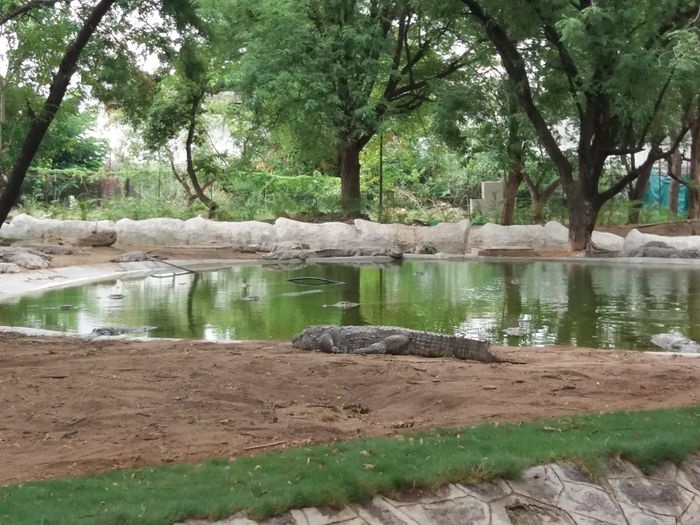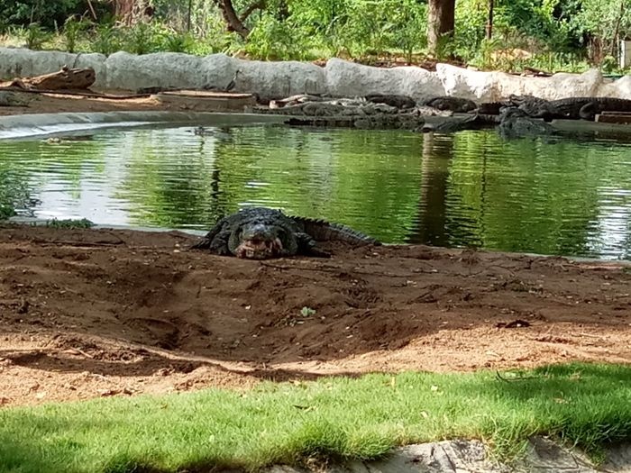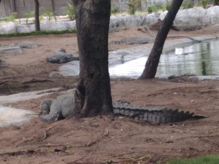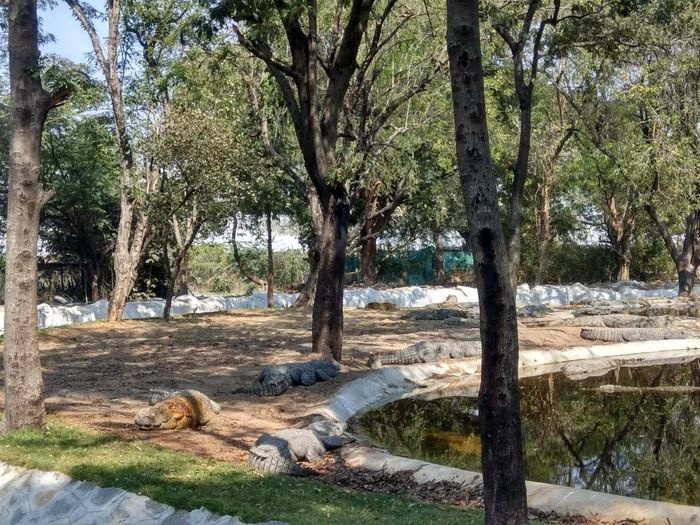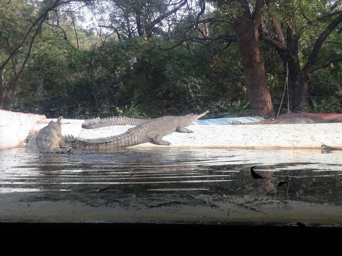 very huge garden, extending over large areas with a picturesque nature full of greenery, trees, plants and beautiful water bodies, containing a huge group of crocodiles spread throughout it, which roam inside the garden, some on land and some swimming in the water, and some standing without movement for long periods, As it is left to live in complete freedom as it is in the forest, it is a magical place worth visiting.