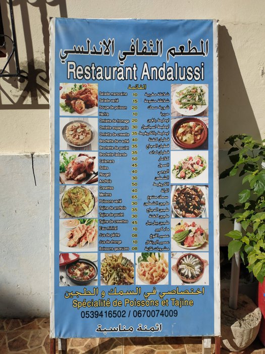 The indoor and outdoor seating in the Andalusian Cultural Restaurant are comfortable and quiet. Customers enjoy sitting on them while eating multiple dishes from the local cuisine, including fish soup, chicken or meat or fish tagine with vegetables, fresh tuna salad, calamari and fried shrimp, and many others. One of the options offered at the most reasonable prices.