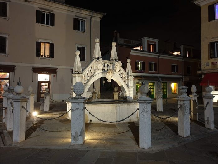 In the heart of the picturesque town of Koper lies this distinctive historic fountain which has an exceptional Italo-European style with backwaters and narrow side streets to a medieval courtyard with a mixture of Gothic and Renaissance architecture. The current fountain dates back to 1666 AD, replacing the older fountain in the same location. It is distinguished by its upper shape in the form of a bridge, and is surmounted by an octagonal basin surrounded by fifteen columns, each of which bears the arms of the local noble families who contributed funds to build the fountain.