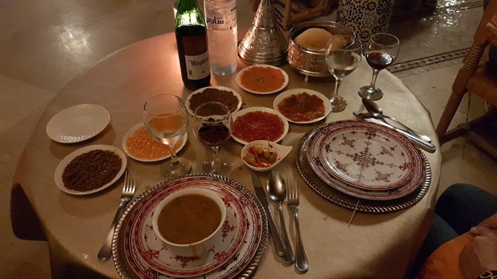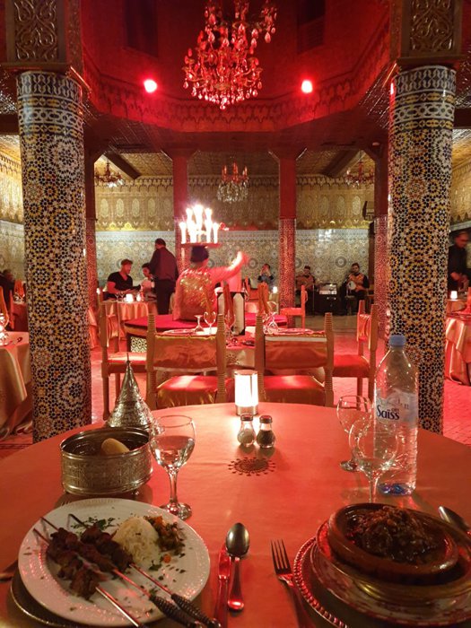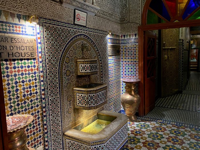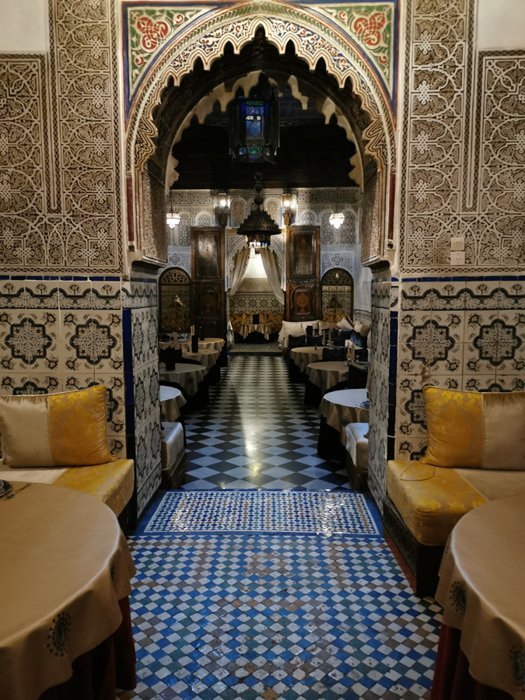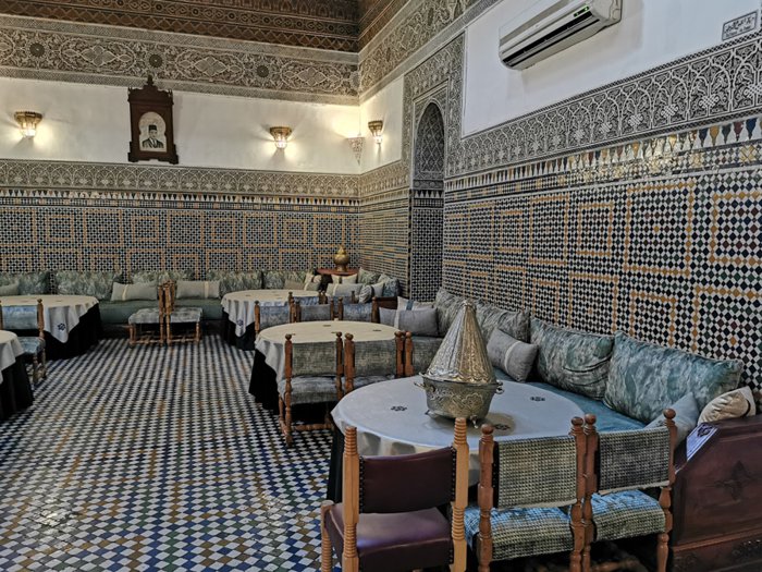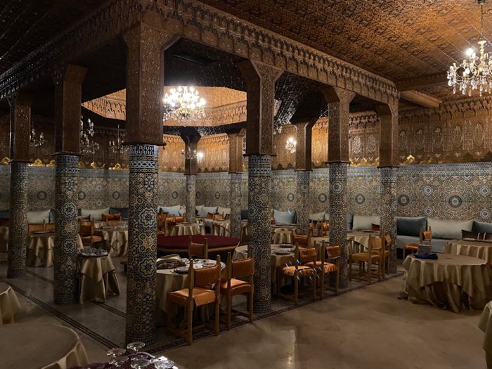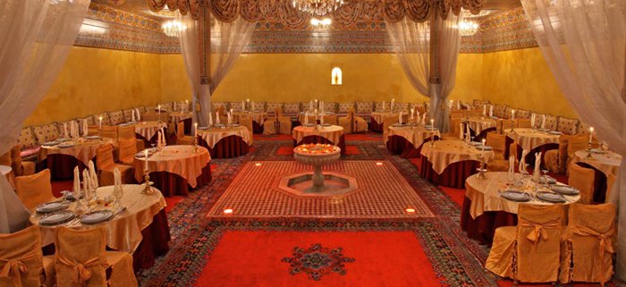 The interior designs of Dar Al Salam Restaurant transport customers to the eras of the country's ancient history, as the inscriptions and decorations of glass and colored stones, which are distributed on the walls and floors, are unique in their charming beauty, in addition to the presence of a small water fountain in the middle of one of the spacious private halls, and the menu includes Varied choices of Moroccan couscous, shish tawook with rice, hot lentil soup, meat tagine, and many more.