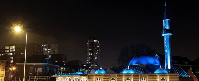 The Eindhoven Central Mosque, also known as the Al-Fatih Mosque, was built with the aim of creating a new meeting place for the Islamic community in the city of Eindhoven. Lights have been used in its design to link culture and religion, which is what most attracts tourists to visit. When the mosque is not in use at night, only blue light illuminates the minaret and domes, but if there is activity, the mosque will light up more.