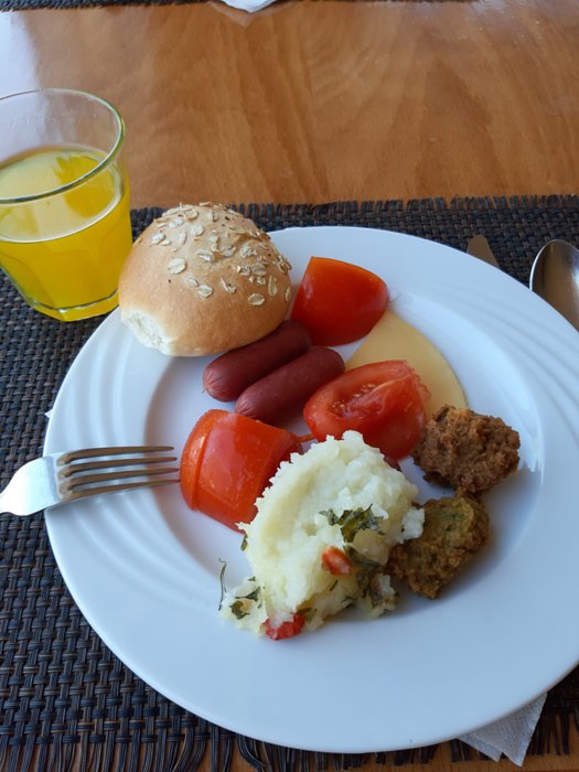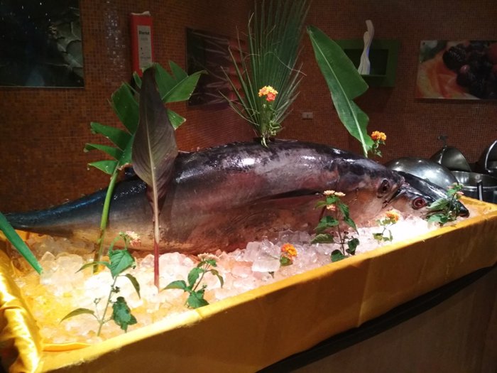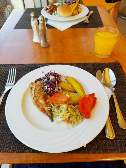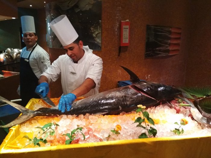 Al Matam Restaurant serves dishes from local and international breakfasts, including omelettes and fried sausages, in addition to pancakes, with mashed potatoes, vegetables, chickpeas and beans. As for dinners and lunches, they are served through an open food buffet, which includes grilled and fried fish in addition to shrimp and calamari. , beef burger and others with drinks and appetizers of salads and crispy fries.