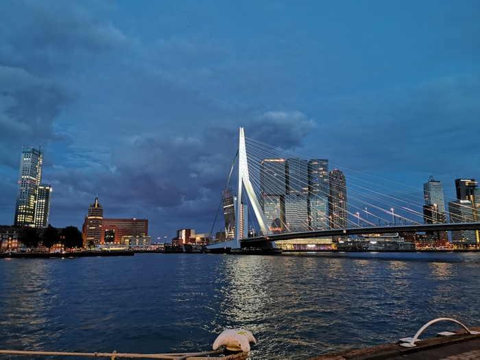 The Erasmus Bridge is a bridge built with cables that began construction in 1986 and ended in 1996. It connects the northern and southern parts of the city. It is the second largest bridge in the Netherlands after the Zeeland Bridge. The length of the Erasmus Bridge is about 802 meters. Which is located opposite it and is distinguished by its bright red color, and the Erasmus Bridge is the most important landmark in the city and is part of its official logo. The bridge appeared in one of the films of the famous actor Jackie Chan (Jackie Chan) and is a famous landmark for tourists who come here for walks and take pictures.
