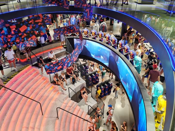 Barcelona Club Museum, which is a large museum that extends over an area of 3,500 square meters, and is visited by approximately 1.2 million visitors annually. It displays the history of the club, and it is surrounded by a wall where visitors touch the glass wall and information, photos or videos appear. The second section is a collection of artworks by the most important artists related to the club. The third section displays the cups won by the club along with a group of the most famous players’ shoes in which the most important goals were scored, in addition to the huge store that includes many memorabilia.