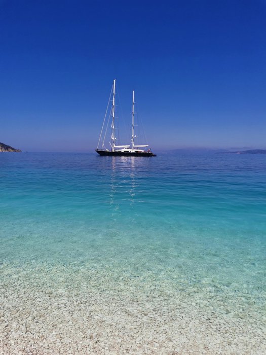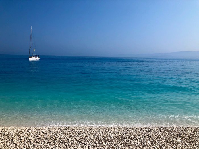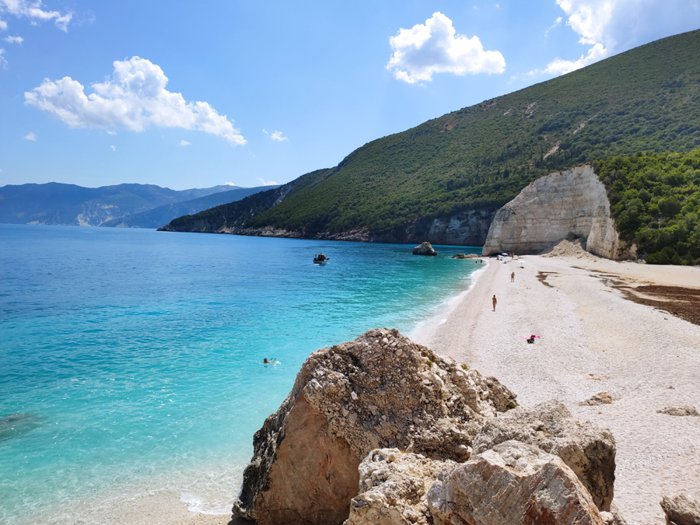 Going to Fteri Beach is a good option for people who love exploration trails and adventure trips, as local guides accompany groups of tourists on a relatively long path between dense green trees and sometimes whitish-gray rocks before they reach the beach and turquoise waters catch their eyes, so they get confused between swimming and boating.