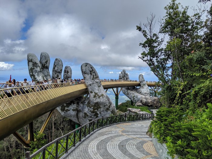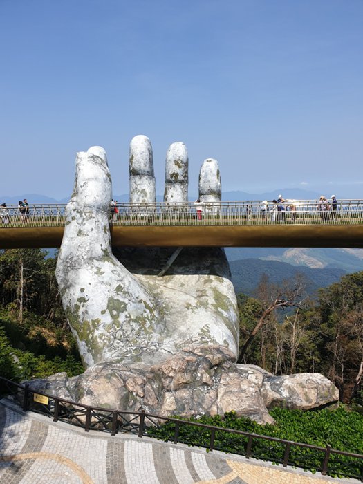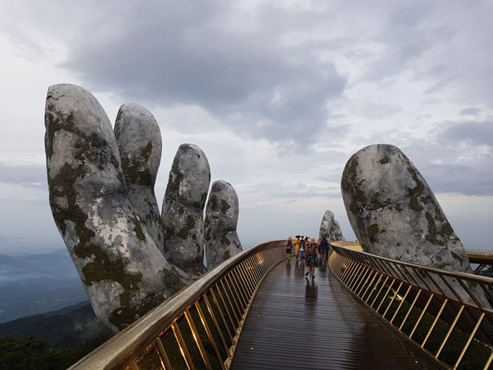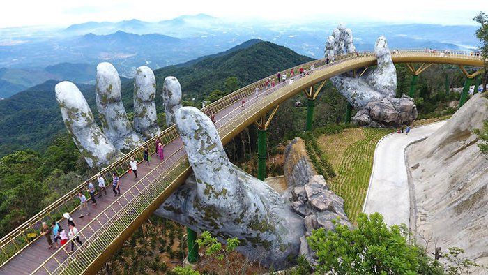 The Golden Bridge is one of the most famous and most vibrant tourist attractions in Vietnam, and it is considered a symbol of tourism in the city of Da Nang, and it is the first destination for many tourists and adventurers from all over the world, and the famous pedestrian bridge enjoys a wide reputation and great popularity among tourists and locals alike, This is due to its unique shape and exceptional location, as it is carried by giant stone hands and carved with high precision. It also provides a charming view of a 150-meter stretch of the surrounding mountain peaks and the deep valleys below.