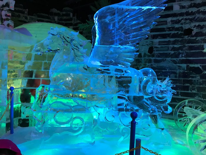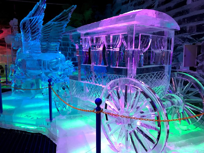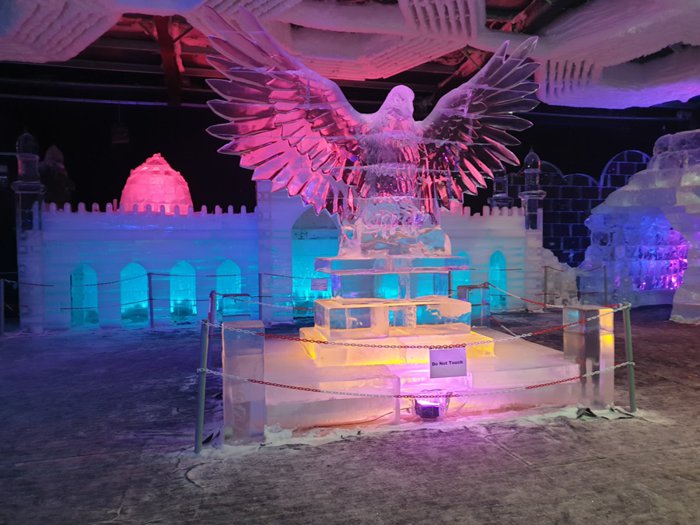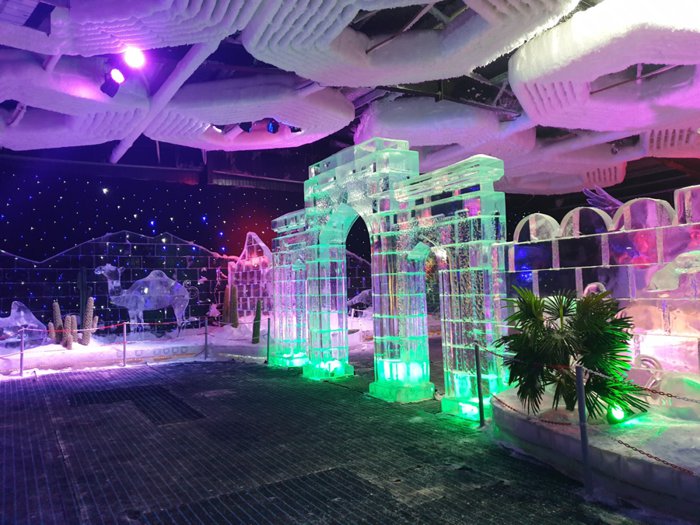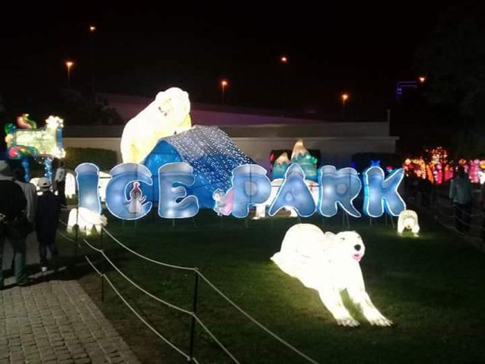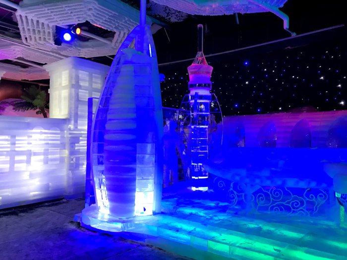 Ice Park is an important tourist attraction in Dubai, because it is unique and provides in its arenas ice miniatures of important landmarks around the world such as the Burj Khalifa and the pyramids. There are also real-size figures of animals such as polar bears, foxes and cats, and a majestic model of a chariot pulled by a winged rhinoceros and others. It is preferable to wear heavy clothes before visiting this landmark, because it is very cold inside.