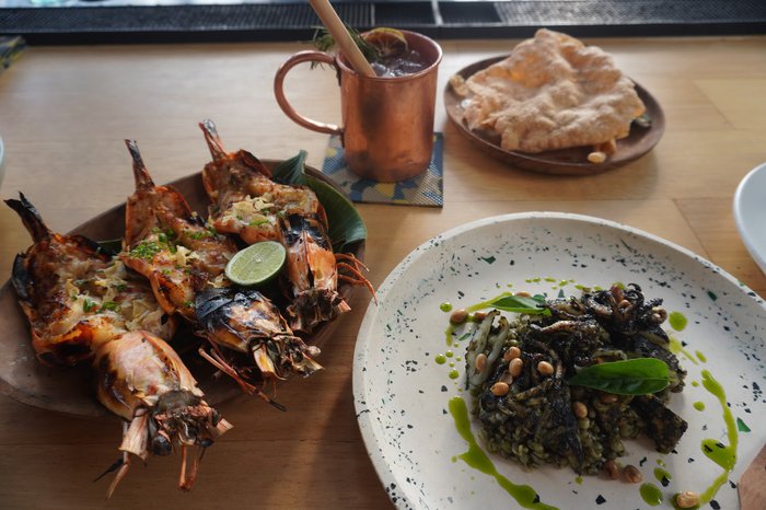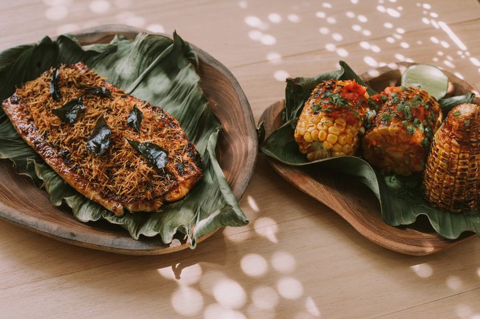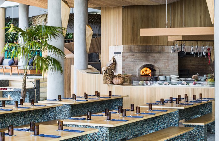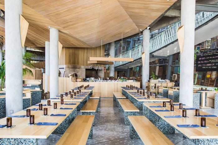 Ijen Restaurant Indonesia's first restaurant with a zero waste philosophy, Ijen proudly serves the freshest locally caught seafood using a hand-rolling process in a spacious environment built from recycled materials. Located inside Bali's most progressive beach club, Ijen at Potato Head is Indonesia's first restaurant with a zero waste philosophy - but that's not all. The seafood fresh from the ocean is simply exquisite, caught locally using the hand-rolling process and classically grilled over an open fire. All menus here are printed on sustainably cut paper and recycled truck tires, the furniture is made from cut foam and recycled wood, and the floors are filled with a mixture of chipped boards, glasses and cement. It's a wonderful space, with equally exceptional dishes, such as mahi-mahi, barramundi and local snapper served alongside an array of inventive vegetable dishes and some of the best local sambal we've ever tasted. This is guilt-free feasting at its best.