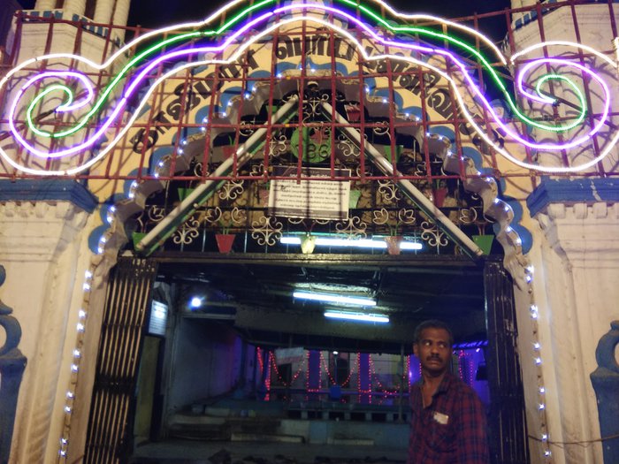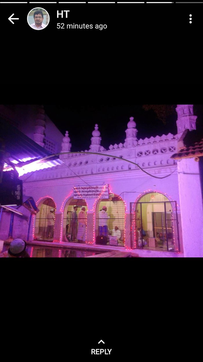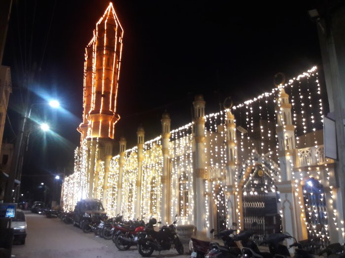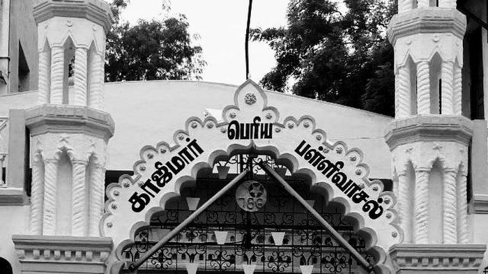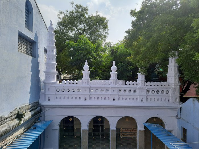 The Kazimar Grand Mosque also known as the Kazimar Periya Paliivasal is the first Islamic mosque established in Madurai. It was founded by Hazrat Kazi Syed Tajuddin, believed to be a direct descendant of the Prophet Muhammad. Today, the mosque is considered a distinctive religious architectural marvel for the city, with its multiple domes, towering minarets, and spacious courtyards that can accommodate nearly 2,500 worshipers. The mosque includes a cemetery and a mausoleum for important Islamic personalities.