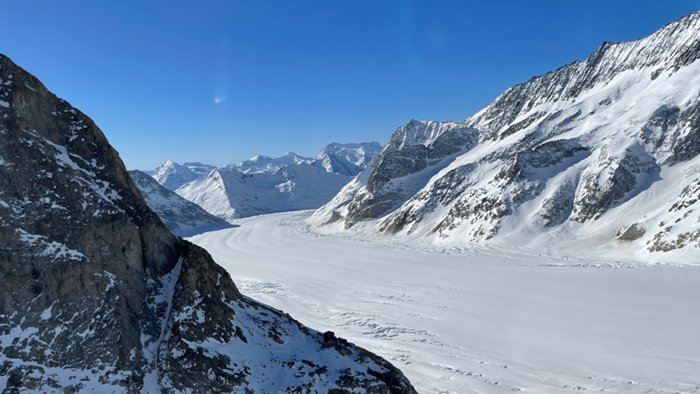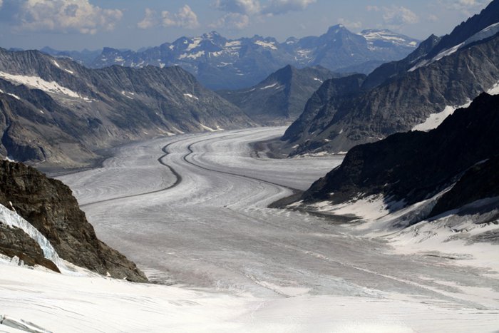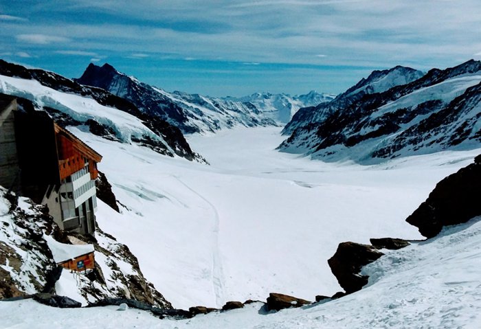 Koncordeplatz is a large flat area of snow and ice just south of the Jungfrau in the Alps in Switzerland, home to three glaciers that come together to form the Aletsch Glacier, three tributaries that join to form a large river. This region is distinguished by its picturesque nature and the cool and refreshing air in it, so do not miss visiting it.