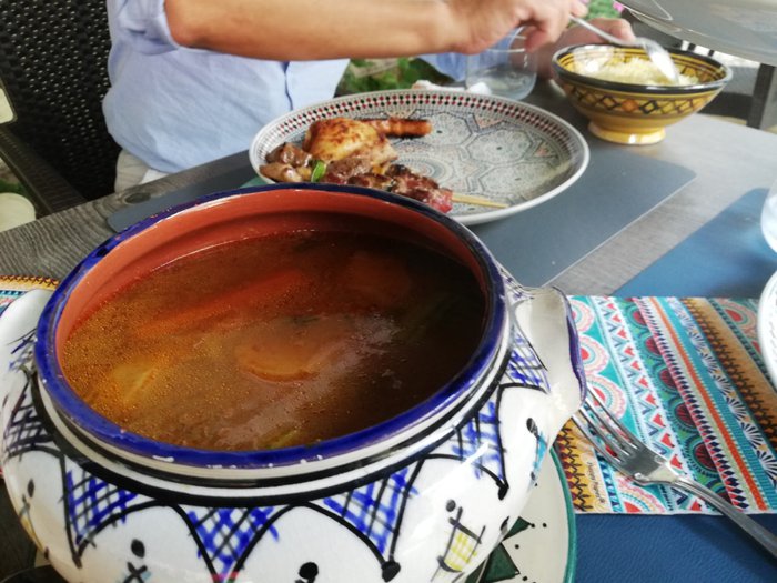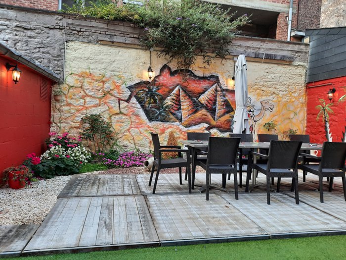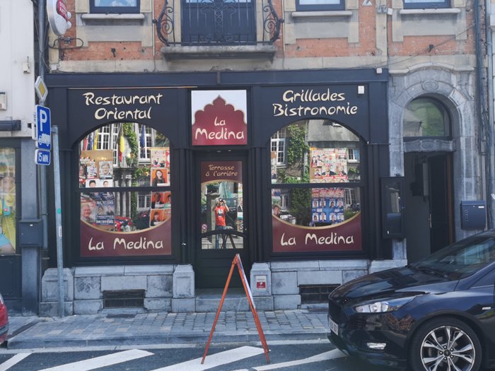 Al-Madina Restaurant, located in Dinant, serves oriental and Arabic dishes, in an inner courtyard with comfortable seating, and seats with umbrellas in the outer courtyard, and among the options offered by the place’s menu are grilled chicken with parsley, meat and vegetable casserole, in addition to cheese pastries, and rice , sausages, kebabs and shish tawook, as well as hot tea.