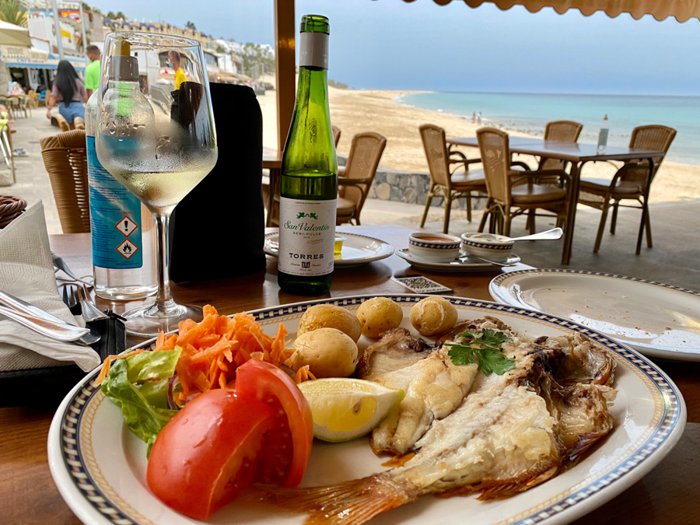 Laga de Moro Jable Restaurant is located at the corner of the boardwalk on the beach in Morro Jable and features beautiful sea views. It serves local and Mediterranean food such as paella with black rice and multiple dishes of fish and seafood such as lobster and crab with tomatoes, fresh peppers and light lemon sauce and pasta dishes, and is distinguished by its friendly staff and excellent service.