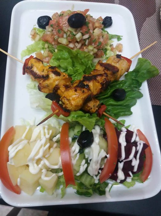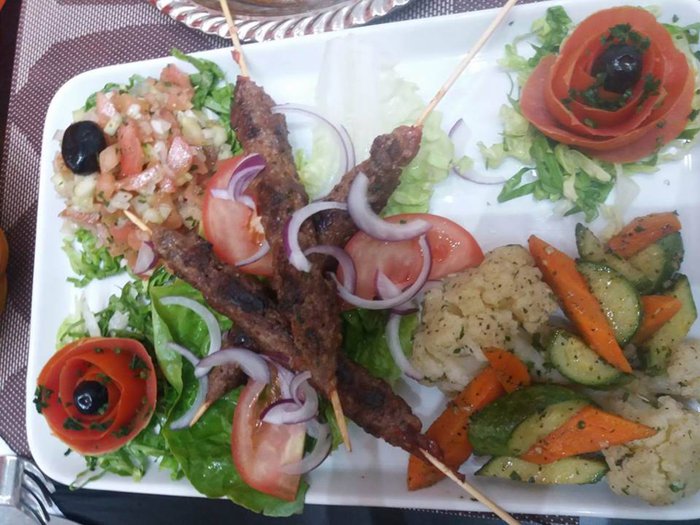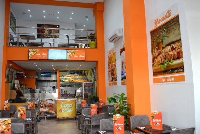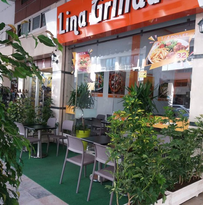 Customers at Lina's Grill Restaurant choose the seating that suits them, between the outdoor seats in front of the front façade of the restaurant, and between the seats that are distributed in the inner hall, and the seats placed on the second floor for more privacy, while they eat one of the delicious local meals, from Moroccan couscous with Vegetables, or grilled kebab fingers with salads, or grilled chicken with french fries, and many others.