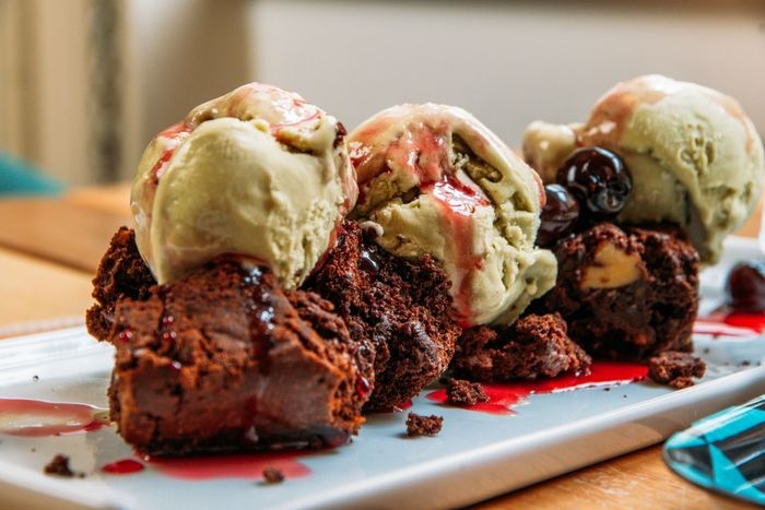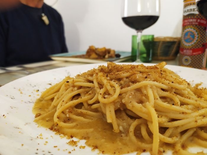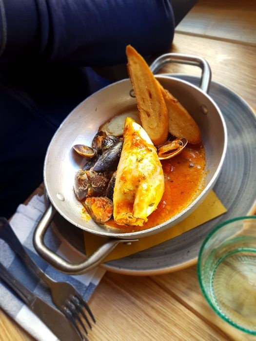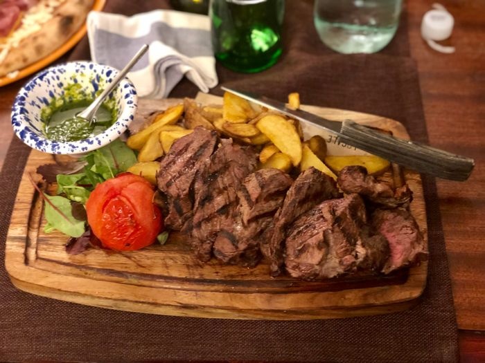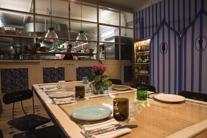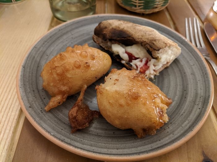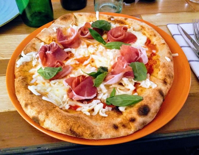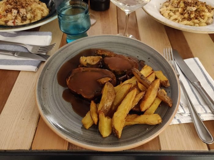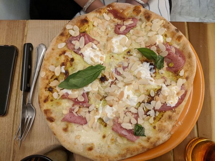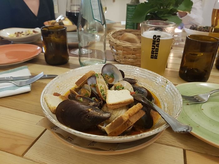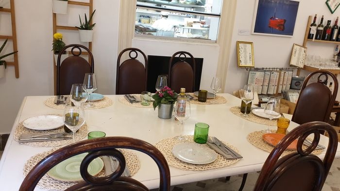 very distinctive restaurant in terms of interior design represented by colorful furniture, ornate walls, and embroidered table covers. The restaurant offers a variety of local food items, such as pizza of all kinds, such as pepperoni pizza, margarita pizza, as well as seafood such as grilled filet fish, oysters with spaghetti, shrimp with vegetables, fried calamari, in addition to pasta with various sauces. The menu also includes many choices of sweets and hot and cold drinks.