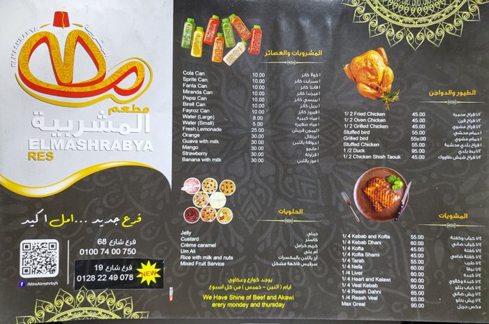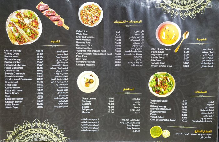 Al-Mashrabiya Restaurant offers a unique selection of local dishes, the most important of which are grills that are seasoned according to special recipes, including kebabs, steaks, and turkey slices, which are served with hummus, fried potatoes, and refreshing drinks. There is also a group of multiple dishes, including lentil and tomato soup, white rice or vermicelli rice. Or stuffed with grape leaves, eggplant, and others.