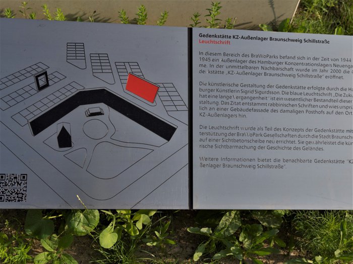 On May 7, 2000, the Braunschweig-Schelstrass Memorial Concentration Camp was inaugurated. The center, in its concept developed by Sigrid Sigurdsson, consists of a tiered base and so-called open archives that invite Braunschweig residents as well as local organisations, associations and institutions to deposit documents, ideas and personal memorabilia there; More than 70 library funds have been assembled for the archives, and selected texts from these archives are displayed on metal panels attached to the wall that forms the boundary of the memorial centre.