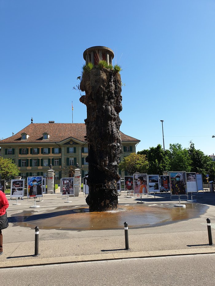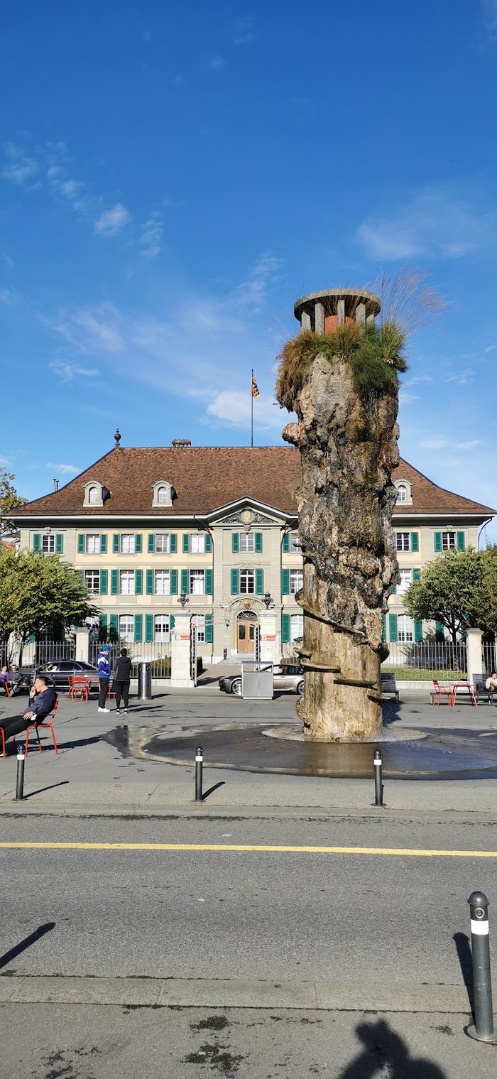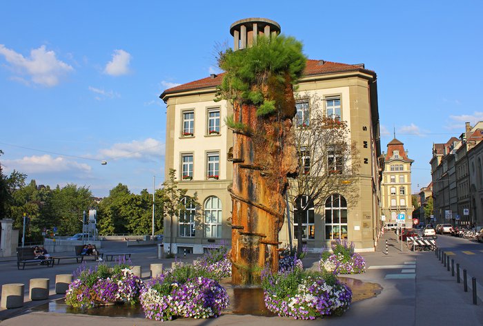 The Meret Oppenheim Fountain, named after the artist who spent part of her life in Switzerland, is eight meters high and was created in 1983. What makes the fountain truly unique are the plants and tufa deposits that thrive around the shaft. In summer, when a cushion of moss and wild grass covers the concrete, the fountain looks like a big green monster, while in winter, when the snow and cold take over, it looks like a butterfly in a cocoon.