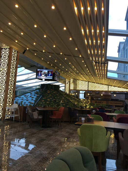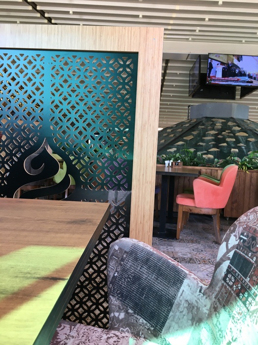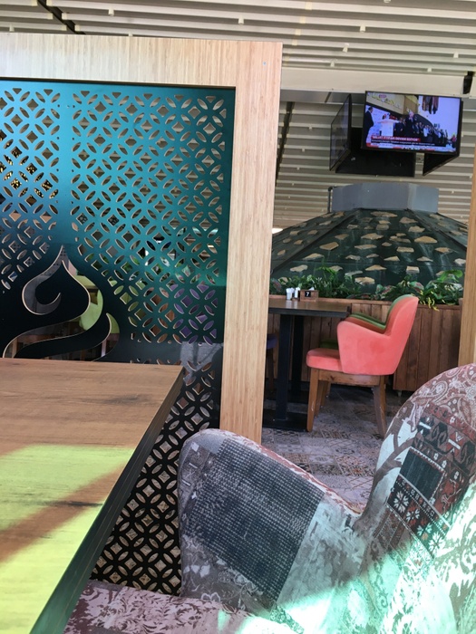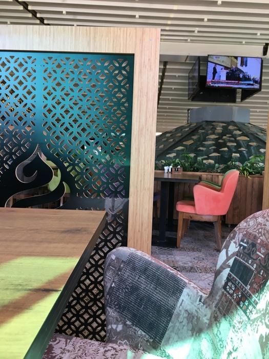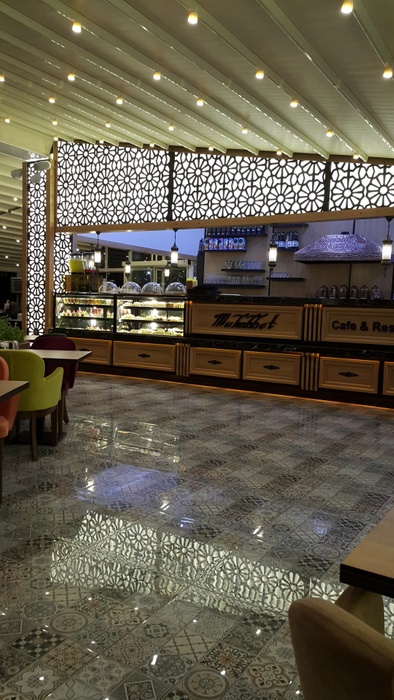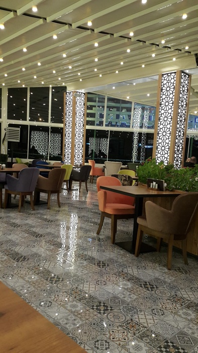 restaurant with a wide area and an intimate and comfortable character, characterized by its contemporary oriental decor, where you find comfortable seats and tables in soft colors, beautiful oriental tiles, and distinctive oriental decorations on the columns and walls. This place offers you delicious Turkish and Arabic dishes. Among the dishes it offers, you will find lentil soup, meat pastry with dough, and other delicious pastries. From grills, you can find kebabs, grilled eggplant, shish tawook, and delicious kofta discs. In addition, it serves shawarma, iskander, and many other dishes. This restaurant also offers desserts such as kunafa, baklava, and others with oriental tea, Turkish coffee, or cold soft drinks.