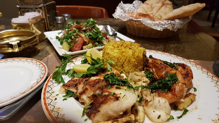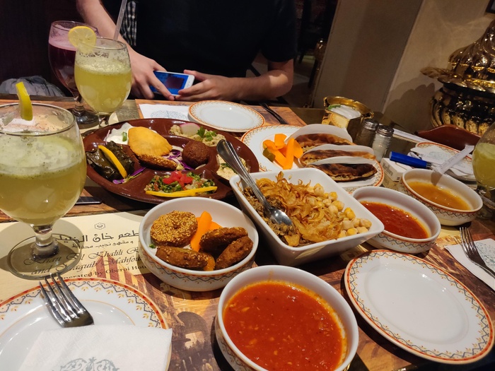 Naguib Mahfouz Restaurant is a distinguished restaurant located in Khan Al-Khalil, and it preserves its ancient heritage, which is shown through its authentic atmosphere and décor that simulates the days of the fifties. The restaurant serves many delicious dishes, such as koshari, stuffed chicken, shawarma, various salads, and appetizers such as baba ghanoush, foul, hummus, falafel, and many others. In addition to desserts such as delicious harissa, Arabic shisha and a range of refreshing drinks. Knowing that the bread he serves is prepared inside the restaurant on the oven, and it is served hot and fresh. It is a wonderful restaurant with beautiful folk decor and the atmosphere is amazing with live music in the background. Visit it and try the delicious dishes it serves with your family or friends.