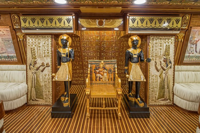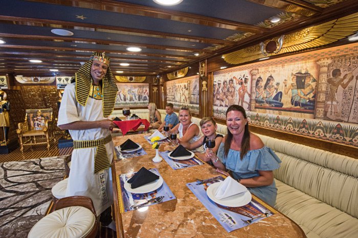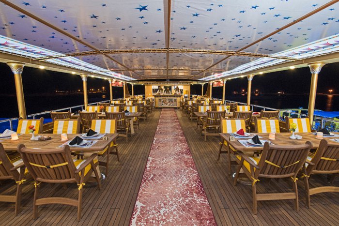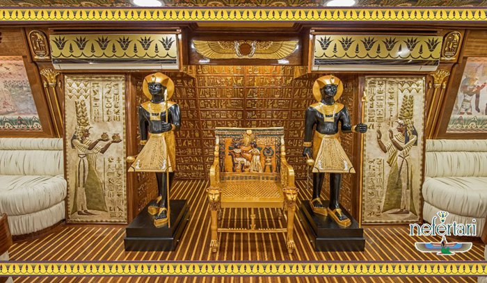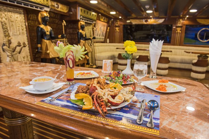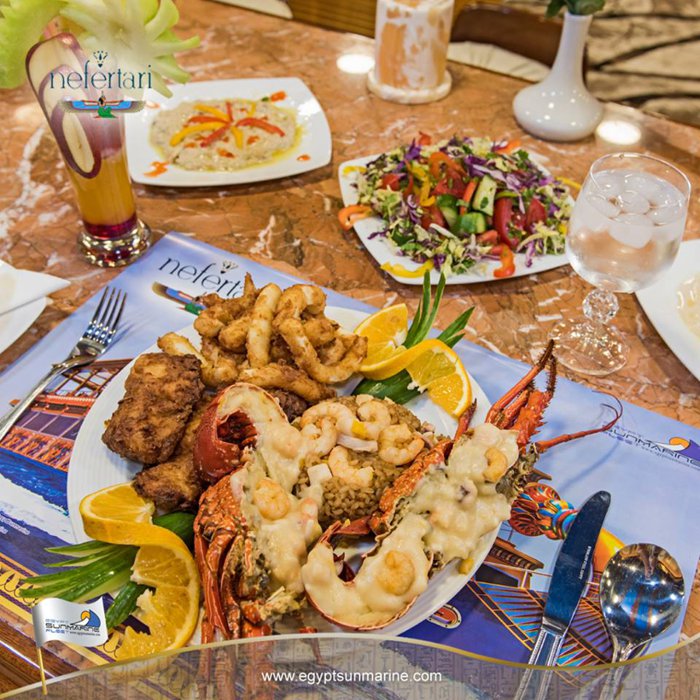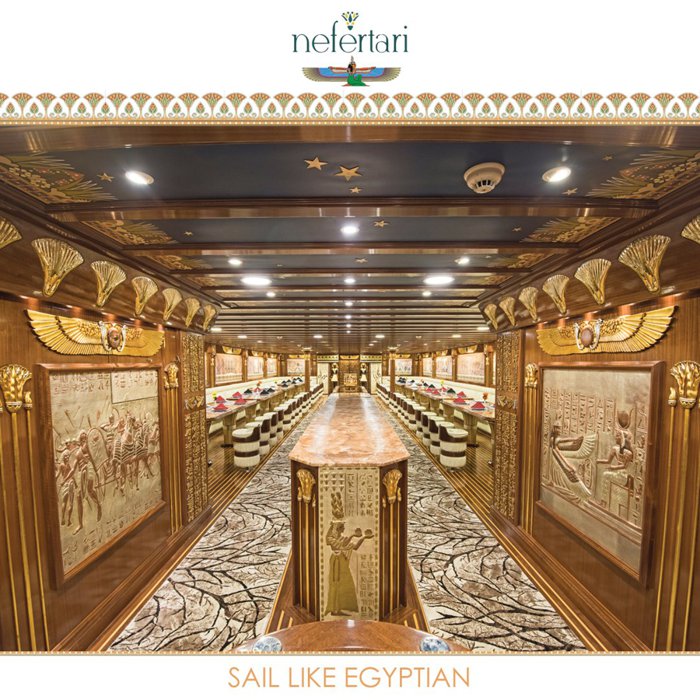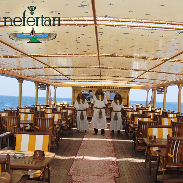 Nefertari's boat is a boat that offers tours at the highest level, and the boat is famous because of its design inspired by the Pharaonic golden ages, which is reflected in all its details, from its external structure to the internal seats in its restaurant, and the boat consists of 3 levels, the first level, in which there is a restaurant It serves local and seafood cuisine, and the second level is an open deck that contains comfortable seats, and the last level is below sea water level, with large glass windows, enabling passengers to view the natural beauty of the marine environment in the Red Sea.