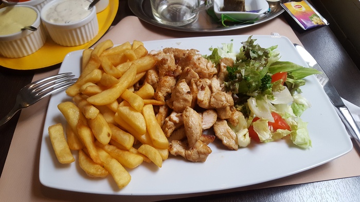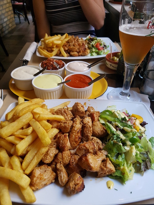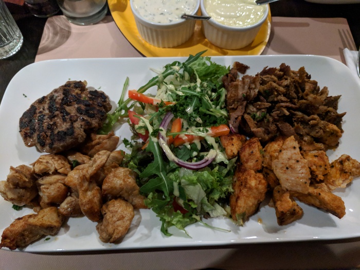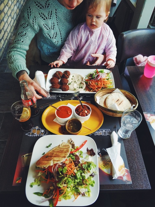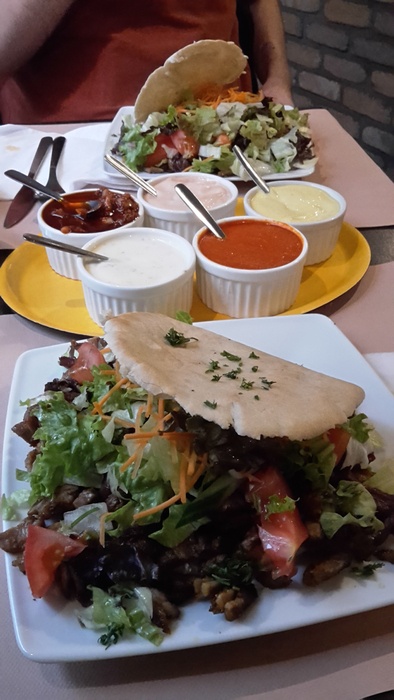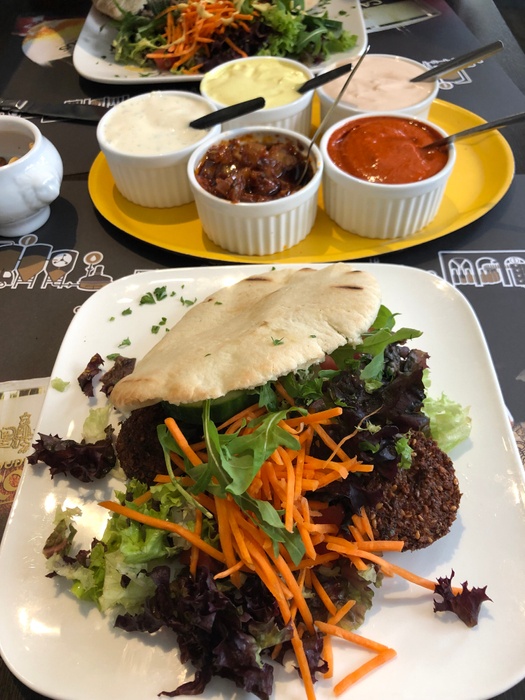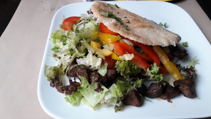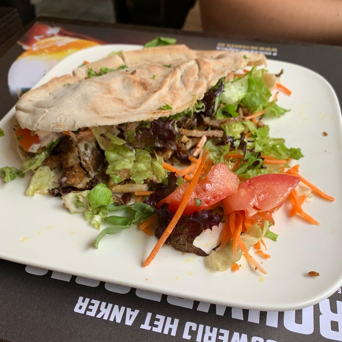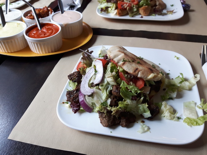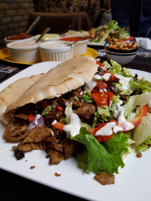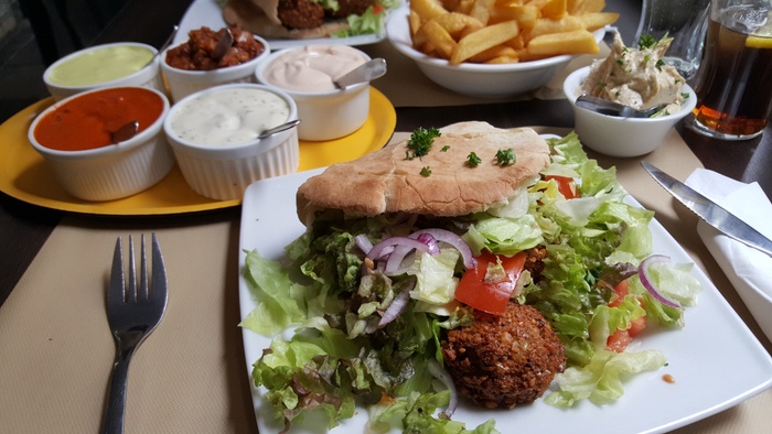 Middle Eastern restaurant with modern Arabic decor and a comfortable atmosphere. It specializes in serving Middle Eastern fast food. Among the dishes offered by the restaurant are falafel dishes or sandwiches, shawarma, and grills such as shish tawook that is served in pita bread alongside fried potatoes and salads such as garlic dip and baba ghanoush. They also serve iced drinks and hot drinks such as tea and coffee.