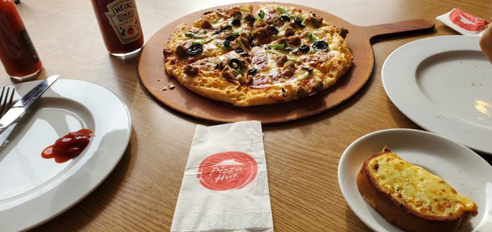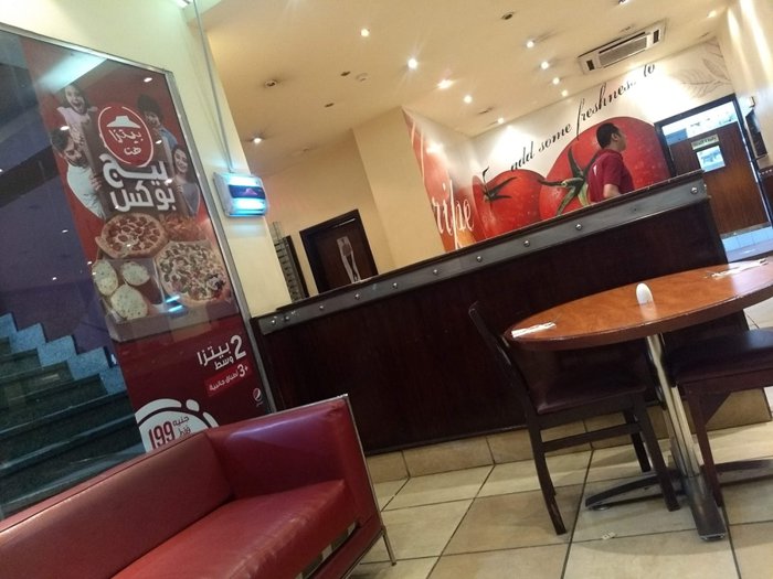 On the first floor of the Pizza Hut restaurant in Western Manial, Old Cairo, Cairo Tourist Governorate, individuals get their various orders through the takeaway takeaway service, where there are also red leather seats to sit on and wait for, but for those who want to eat their orders in the place, they have to go up to The second floor, where seats and wooden tables are distributed, to sit and eat one of the options of vegetable pizza, pepperoni pizza, cheese pizza, cheese edges pizza, which is famous for its distinctive taste, and many others, in addition to the presence of some additions of chicken wings and garlic bread, and the main meals are served With various soft drinks.