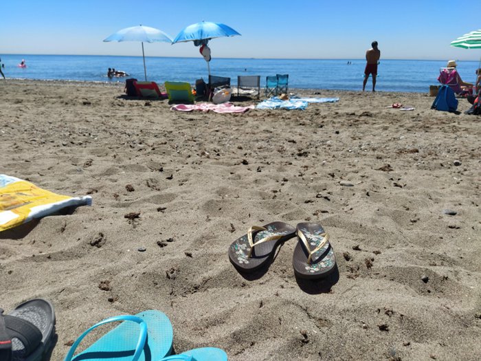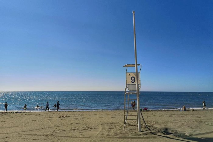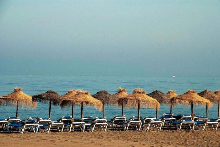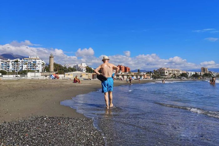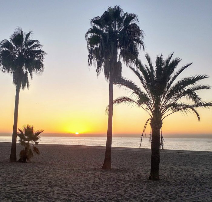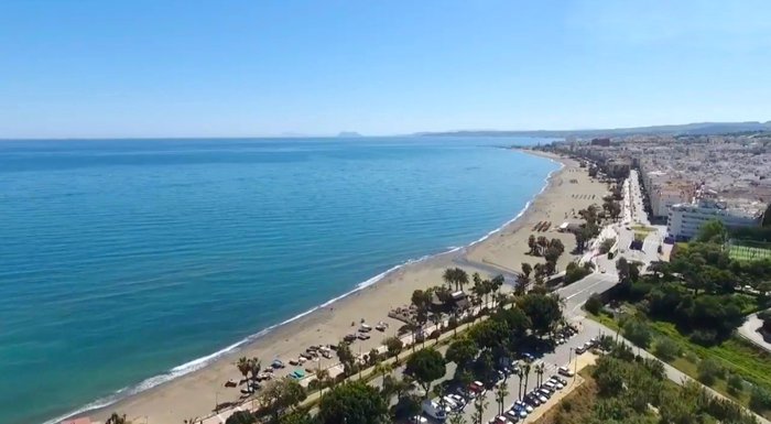 La Rada Beach, in the city of Estepona, is one of the most famous beaches in the city, because of its gray sand, blue waters, and tall palm trees, which makes it ideal for tourists and locals who want to practice sports activities, including swimming, playing volleyball on the beach, and also building castles. Sandy, sunbathing.
