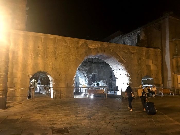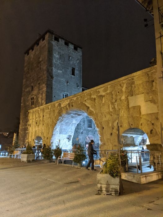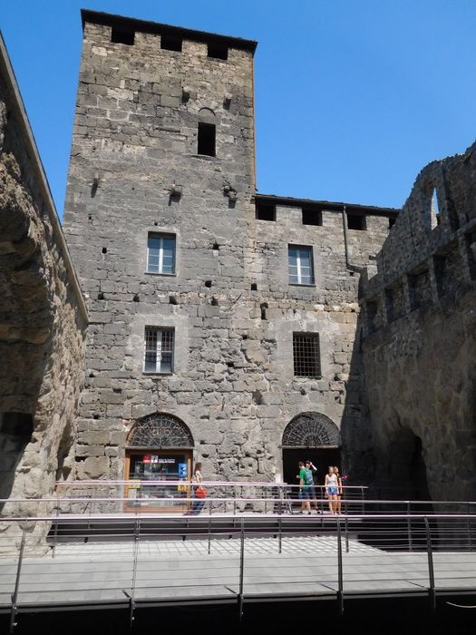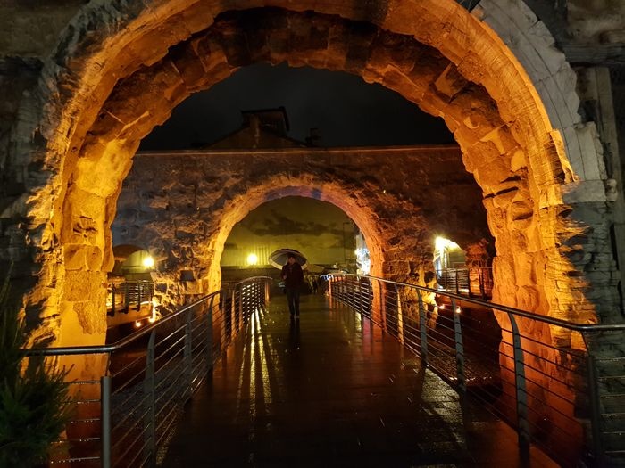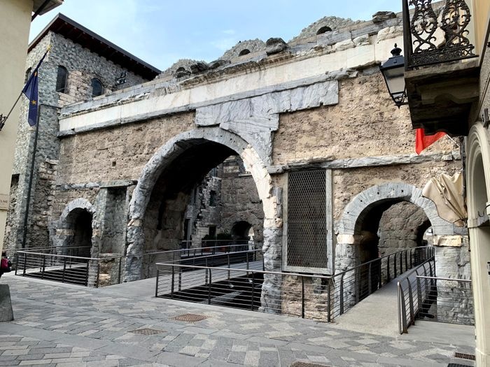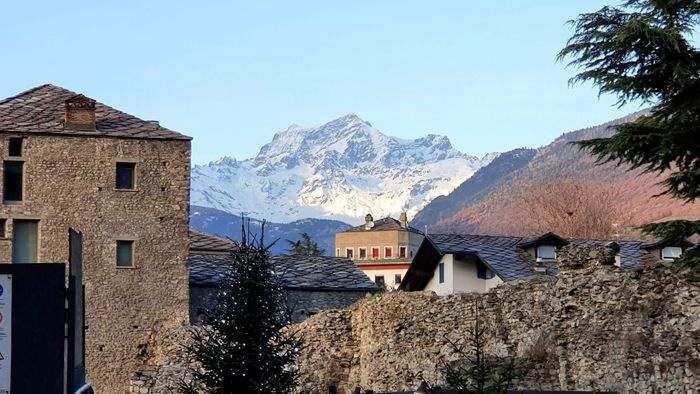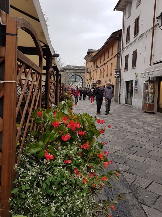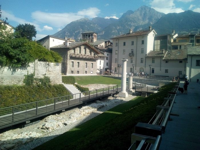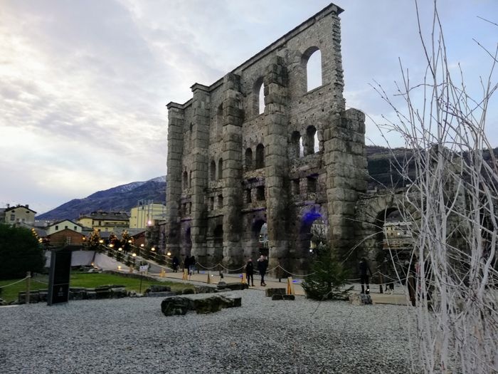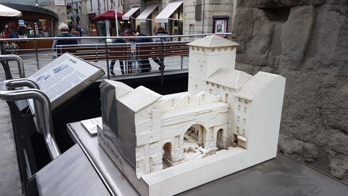 The Pretoria Gate is the eastern gate to the city of Aosta. It is a Roman stone gate built in 25 BC. The gate still maintains its shape as the eastern façade still contains some marble panels. The gate consists of three openings: the central opening for vehicles, and the side openings for pedestrians. The gate is located in a central square in Aosta, where tourists flock, as it includes many monuments surrounding the gate, such as statues and memorials, as well as many double arches.