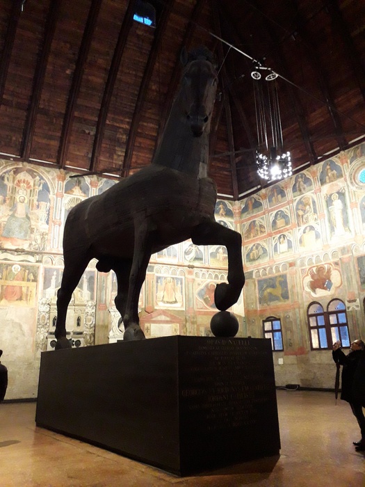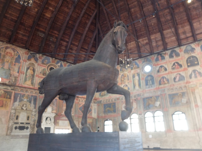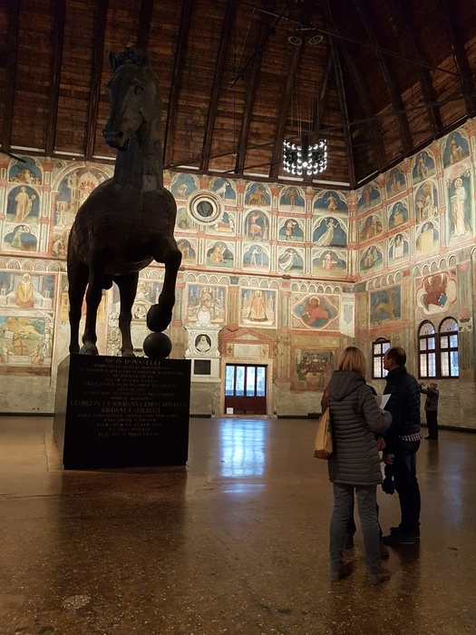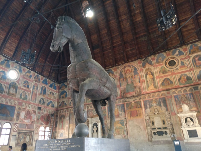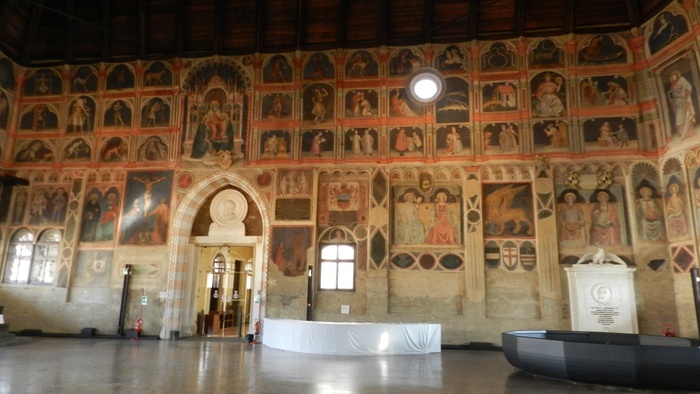 The Ragioni Palace is a city hall whose construction dates back to the Middle Ages. It was originally a palace for the building of justice in Padua, and it is believed to be one of the largest halls of the Middle Ages, which still exists until the Boom. The palace is distinguished by its unique architecture, as it takes the form of a rectangle with a length of 81.5 m, a width of 27 m, and a height of 24 m. Its walls are covered with a rich collection of wall paintings, along with many statues and sculptures that decorate the interior hall. The hall has undergone many restorations over the years. Ages, which resulted in the final form we see today.