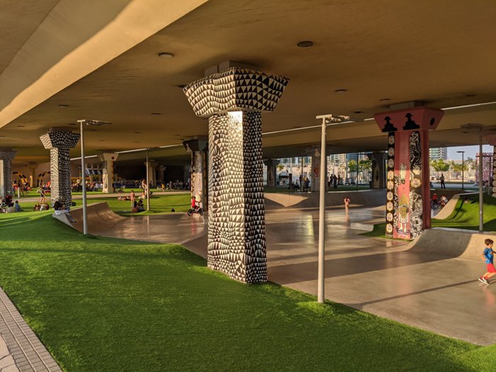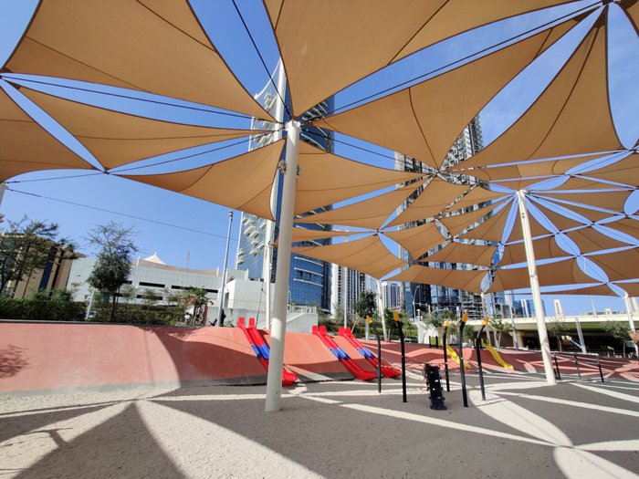 Perhaps it is strange that what distinguishes this garden is not only the natural green spaces, but the design of the 24 shaded columns in the place, which was sponsored by four of the best engineers in the city. On these surfaces, the colors are refracted on the floor below. The park also has many facilities, including playgrounds and food trucks.