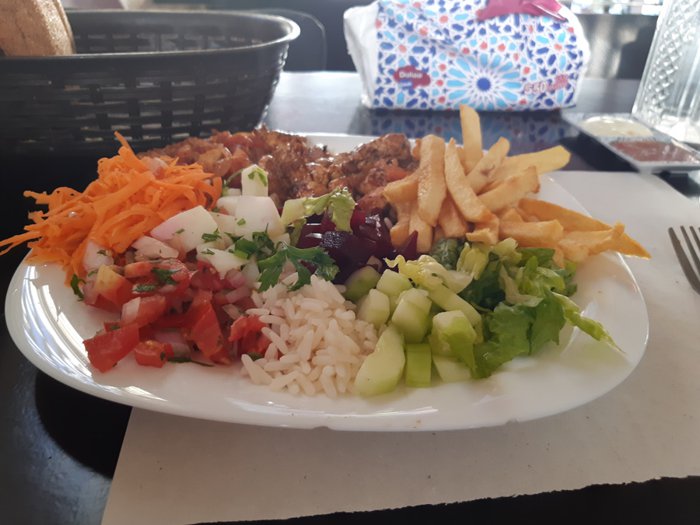 The menu at Al-Madina Restaurant, located in the city of Azure, includes many delicious options, so it meets the different needs of customers and satisfies their tastes, as it includes American burgers, Italian pizza, shawarma rolls, Moroccan couscous with vegetables, and grilled kebab fingers with salads. And many others, which are served with cold or hot drinks, according to the customer's choice.