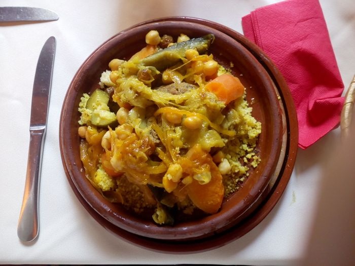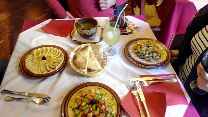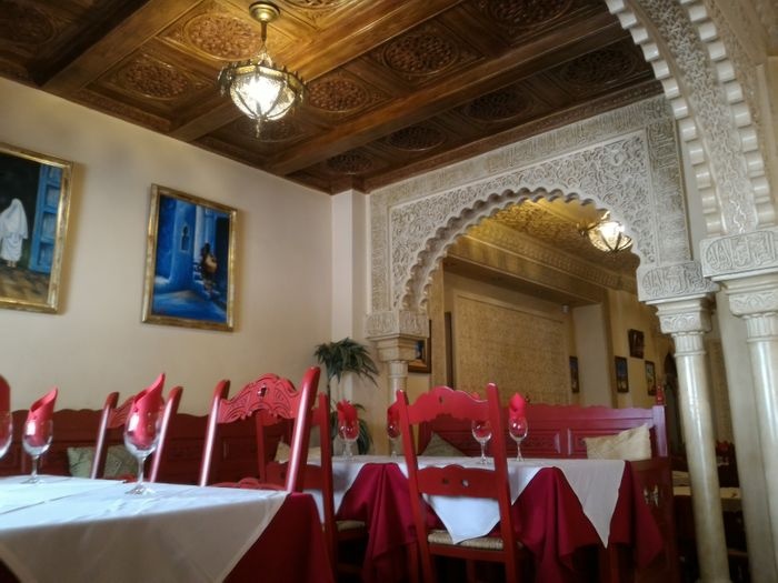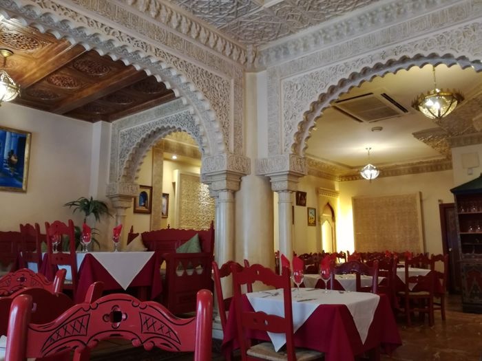What distinguishes Al-Sultan Restaurant, located in the city of Granada, is its Moroccan-style decor. Its menu includes distinctive Moroccan and oriental food, such as couscous, meat tagine, chicken, harira soup, hummus, kebabs, shish tawook, and a variety of salads, in addition to authentic Moroccan tea and a group of oriental sweets.